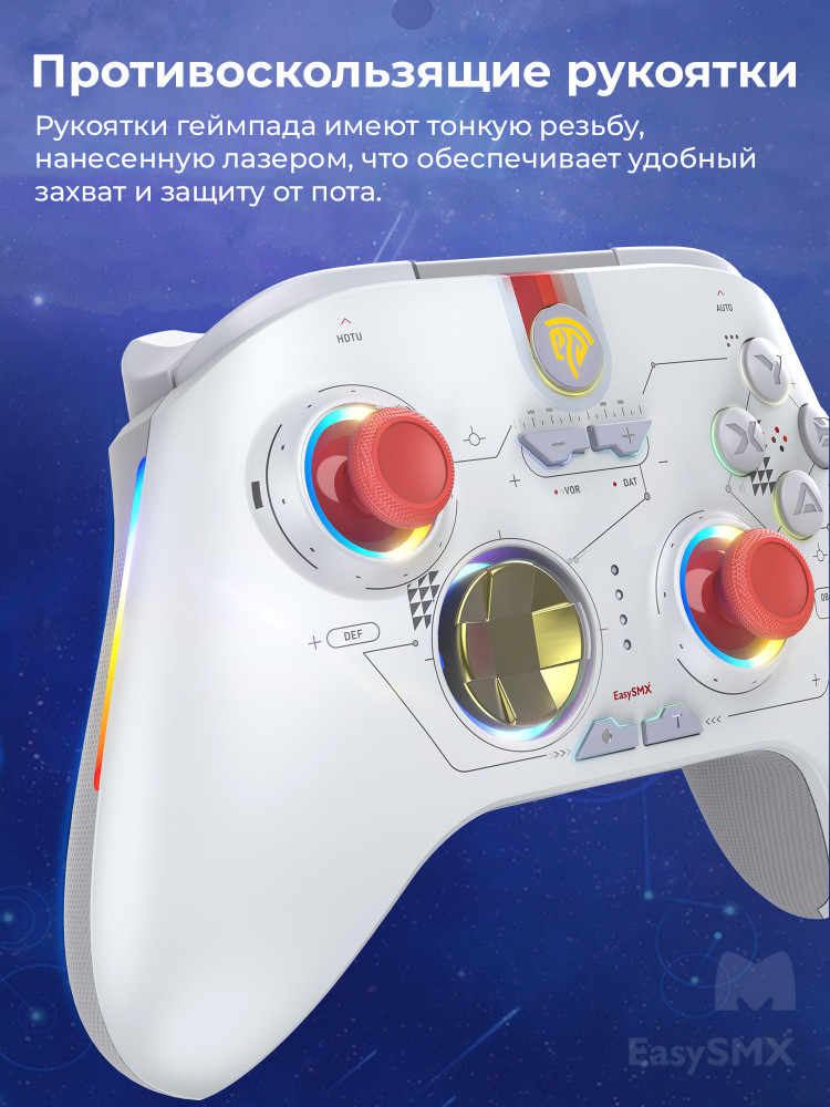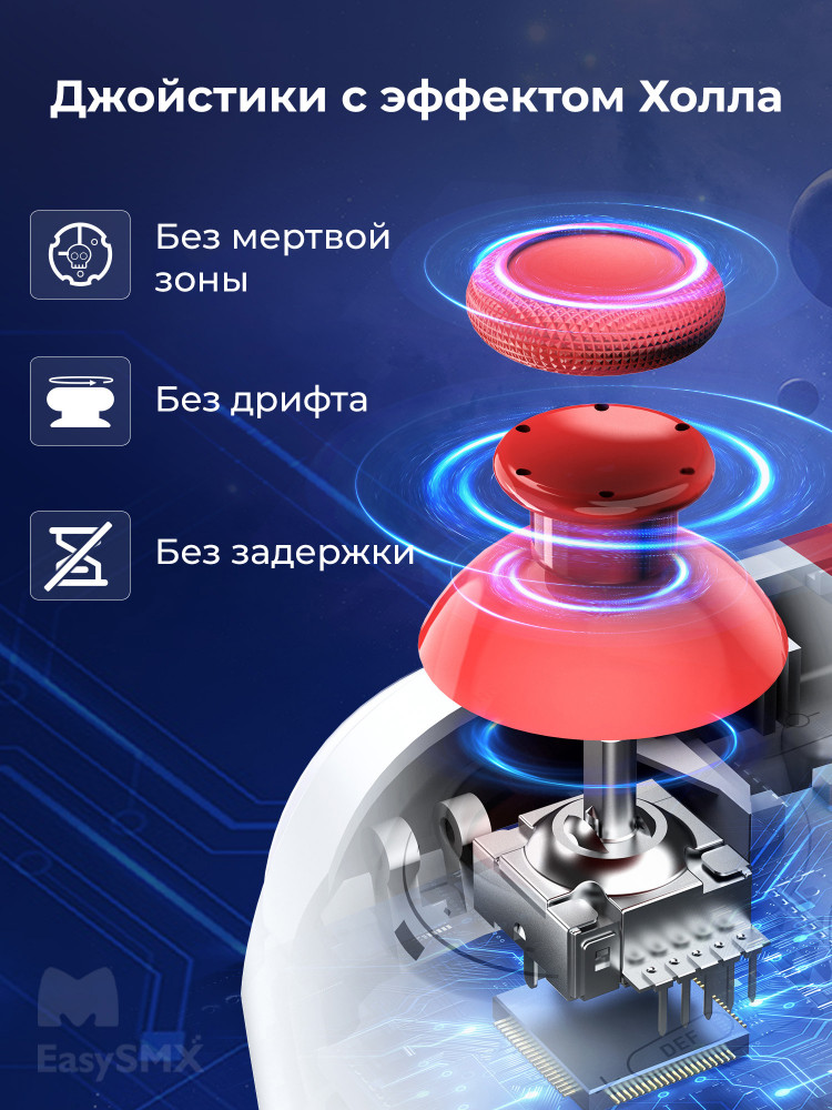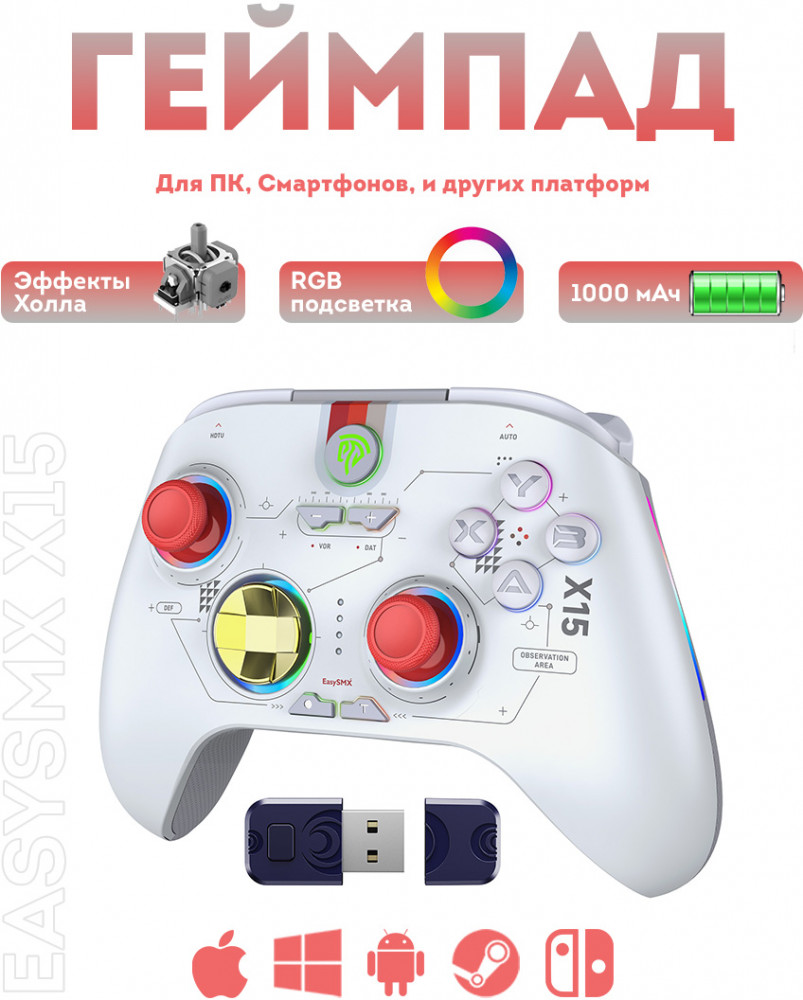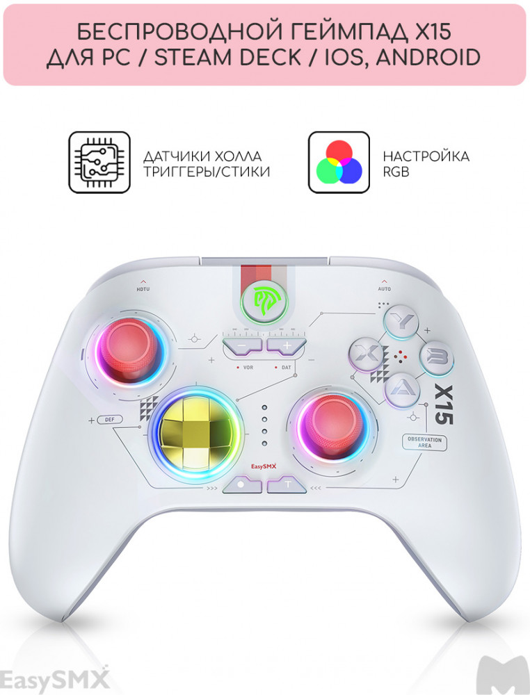 В данный момент этот товар отсутствует в продаже. Возможно, у нас найдется аналогичный или похожий товар здесь. Беспроводной геймпад EasySMX X15 с RGB-подсветкой и датчиками Холла на триггерах и стиках идеально подходит для геймеров, которым нужен высокоточный и долговечный контроллер. Это отличный выбор для геймеров, которые ищут не только надёжный контроллер, но и продвинутые функции и стильный дизайн.