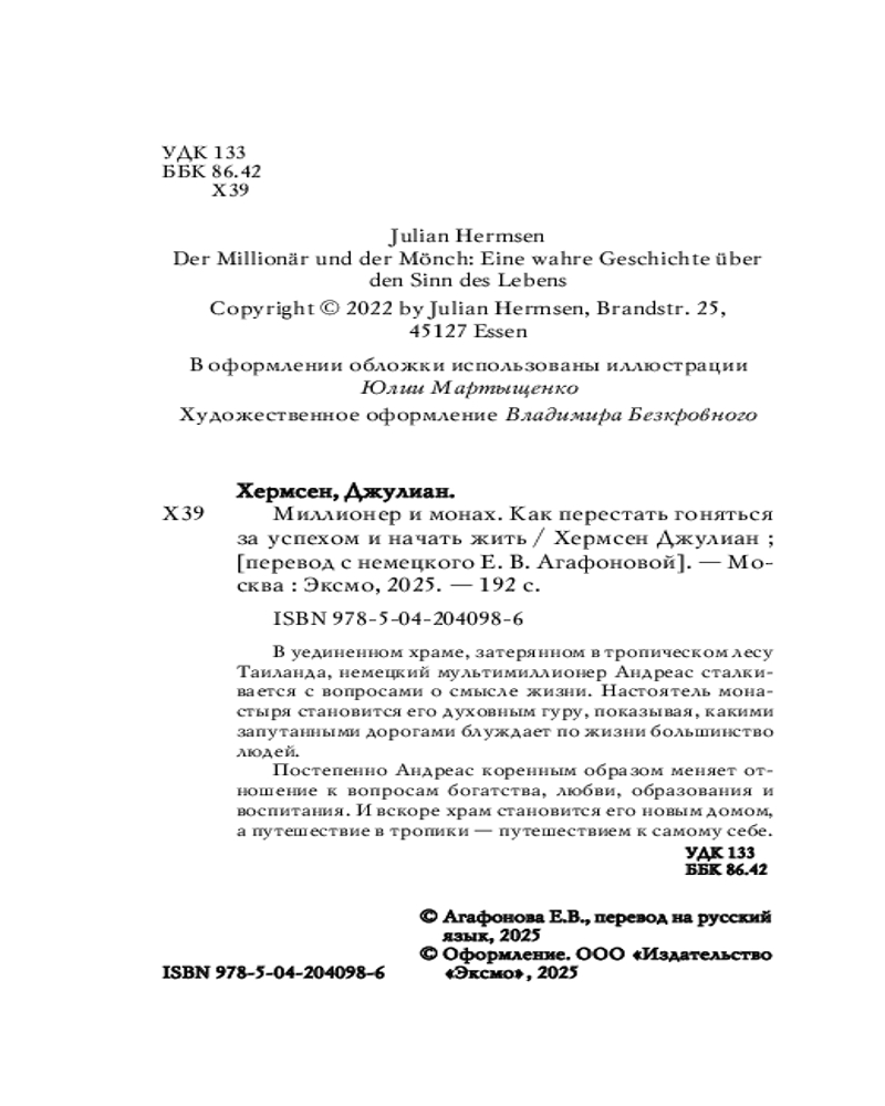 💳 Оплатить за товар можно при получении 🇰🇿 Есть бесплатная доставка по Казахстану от 1 дня 🎁 Копите бонусы с каждой покупки Серия: Городской монах В уединенном храме, затерянном в тропическом лесу Таиланда, немецкий мультимиллионер Андреас сталкивается с вопросами о смысле жизни. Настоятель монастыря становится его духовным гуру, показывая, какими запутанными дорогами блуждает по жизни большинство людей. Постепенно Андреас коренным образом меняет отношение к вопросам богатства, любви, образования и воспитания. И вскоре храм становится его новым домом, а путешествие в тропики — путешествием к самому себе. |
