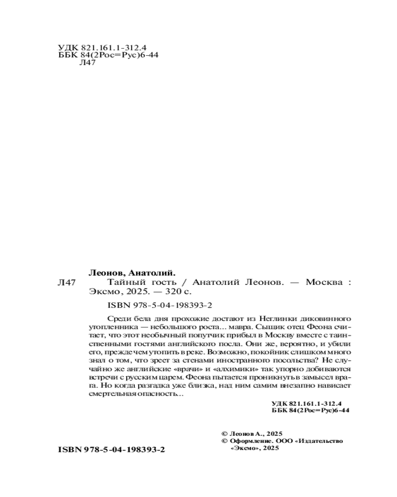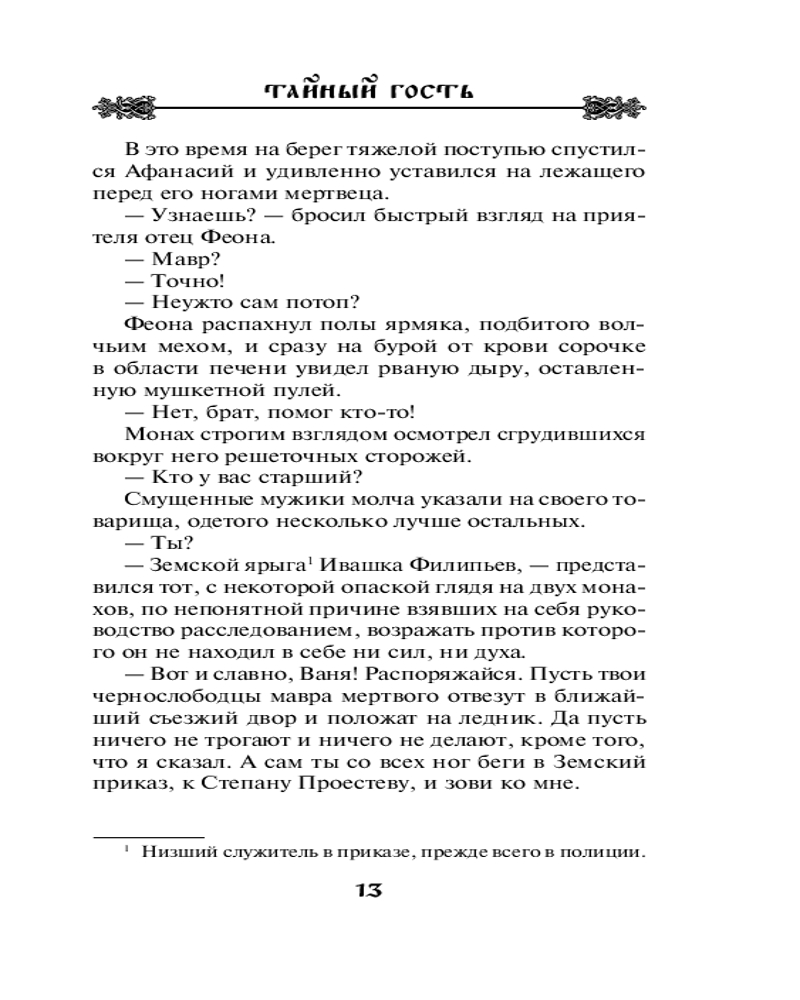 В данный момент этот товар отсутствует в продаже. Возможно, у нас найдется аналогичный или похожий товар здесь. Серия: Отец Феона. Монах-сыщик Среди бела дня прохожие достают из Неглинки диковинного утопленника — небольшого роста... мавра. Сыщик отец Феона считает, что этот необычный попутчик прибыл в Москву вместе с таинственными гостями английского посла. Они же, вероятно, и убили его, прежде чем утопить в реке. Возможно, покойник слишком много знал о том, что зреет за стенами иностранного посольства? Не случайно же английские «врачи» и «алхимики» так упорно добиваются встречи с русским царем. Феона пытается проникнуть в замысел врага. Но когда разгадка уже близка, над ним самим внезапно нависает смертельная опасность...