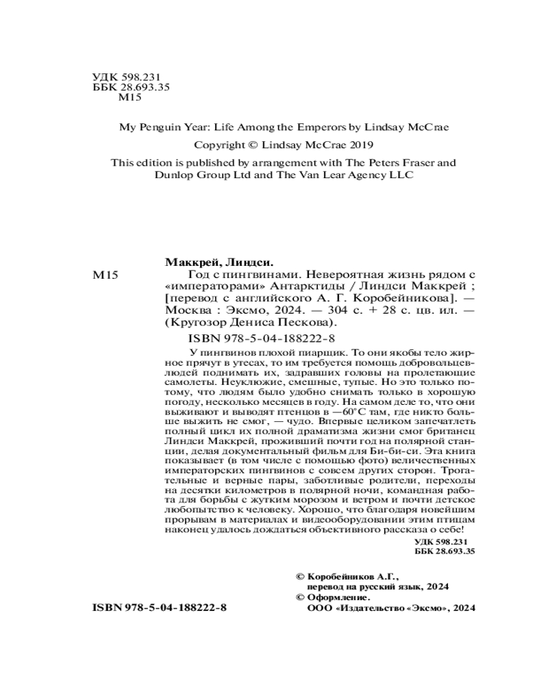 💳 Оплатить за товар можно при получении 🇰🇿 Есть бесплатная доставка по Казахстану от 1 дня 🎁 Копите бонусы с каждой покупки Серия: Кругозор Дениса Пескова Впервые целиком запечатлеть полный цикл жизни пингвинов смог британец Линдси Макрей, проживший почти год на полярной станции, делая документальный фильм для Би-Би-Си. Эта книга показывает (в том числе с помощью фото) величественных императорских пингвинов с совсем других сторон. Трогательные и верные пары, заботливые родители, переходы на десятки километров в полярной ночи, командная работа для борьбы с жутким морозом и ветром и почти детское любопытство к человеку. Хорошо, что благодаря новейшим прорывам в материалах и видеооборудовании этим птицам, наконец, удалось дождаться объективного рассказа о себе! |