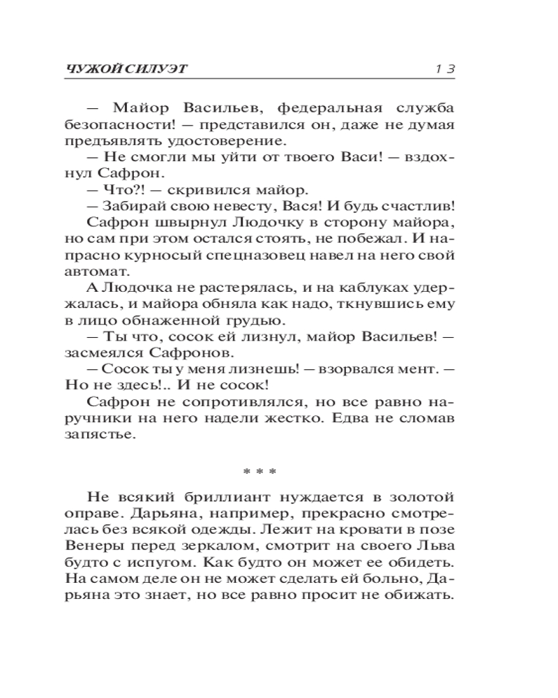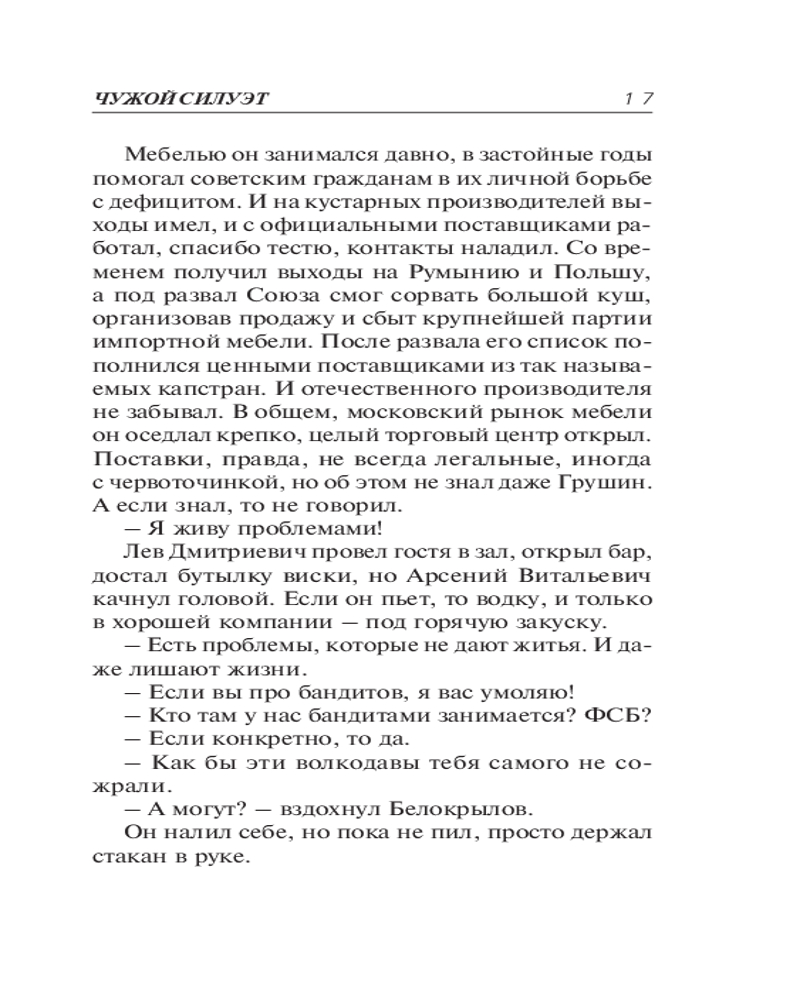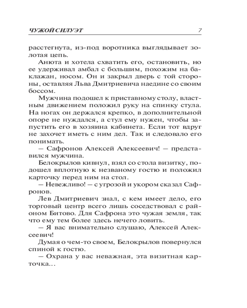 Чужой силуэтВ данный момент этот товар отсутствует в продаже. Возможно, у нас найдется аналогичный или похожий товар здесь. Серия: Колычев. Лучшая криминальная драма В своем особняке застрелена жена бизнесмена Льва Белокрылова Агата. Труп обнаружила охрана, она же вызвала полицию. По версии прибывшего на место происшествия капитана полиции Степана Кручи, женщина застала в своем доме грабителя, который открыл огонь. В самый разгар осмотра приходит известие, что одновременно с Агатой убит и ее муж, ночевавший у любовницы. Не слишком похоже на простое совпадение... Капитан Круча знал, что у Белокрылова были проблемы с местным авторитетом Сафроном из-за денег. Неужели бандит пошел на крайние меры? В тот момент сыщик не принимал во внимание, что, кроме денег, была и другая веская причина, которая могла заставить убийцу взяться за оружие... |