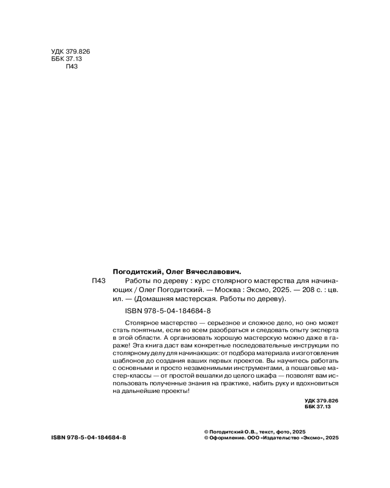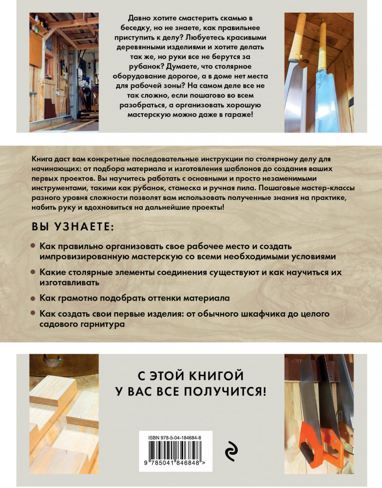 💳 Оплатить за товар можно при получении 🇰🇿 Есть бесплатная доставка по Казахстану от 1 дня 🎁 Копите бонусы с каждой покупки Серия: Домашняя мастерская. Работы по дереву Давно заглядываетесь на красивые деревянные изделия и хотите когда-нибудь сделать что-то подобное своими руками, например скамейку в беседку, но каждый раз откладываете? На самом деле в столярке нужно последовательно во всем разобраться, чтобы дело не казалось таким сложным. И даже совсем не обязательно строить отдельное помещение для мастерской — ее вполне можно организовать даже в гараже! |