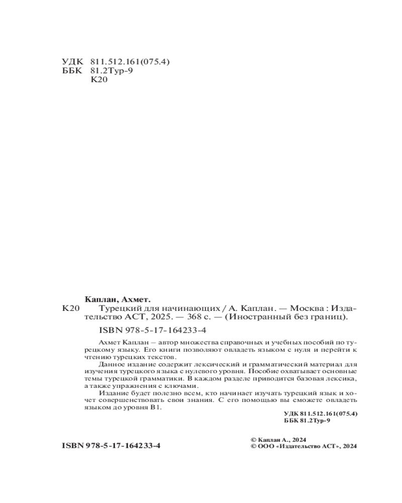 Серия: Иностранный без границ Ахмет Каплан — автор множества справочных и учебных пособий по турецкому языку. Его книги позволяют овладеть языком с нуля и перейти к чтению турецких текстов. Данное издание содержит лексический и грамматический материал для изучения турецкого языка с нулевого уровня. Пособие охватывает основные темы турецкой грамматики. В каждом разделе приводится базовая лексика, а также упражнения с ключами. Издание будет полезно всем, кто начинает изучать турецкий язык и хочет совершенствовать свои знания. С его помощью вы сможете овладеть языком до уровня B1. |
