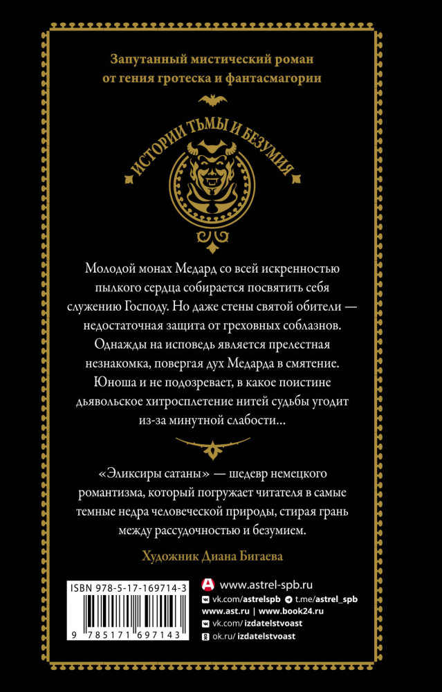 💳 Оплатить за товар можно при получении 🇰🇿 Есть бесплатная доставка по Казахстану от 1 дня 🎁 Копите бонусы с каждой покупки Серия: Истории тьмы и безумия Молодой монах Медард со всей искренностью пылкого сердца собирается посвятить себя служению Господу. Но даже стены святой обители — недостаточная защита от греховных соблазнов. Однажды на исповедь является прелестная незнакомка, повергая дух Медарда в смятение. Юноша и не подозревает, в какое поистине дьявольское хитросплетение нитей судьбы угодит из-за минутной слабости... |