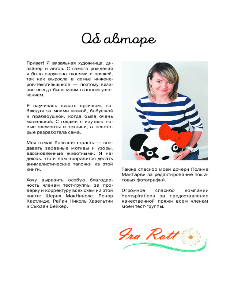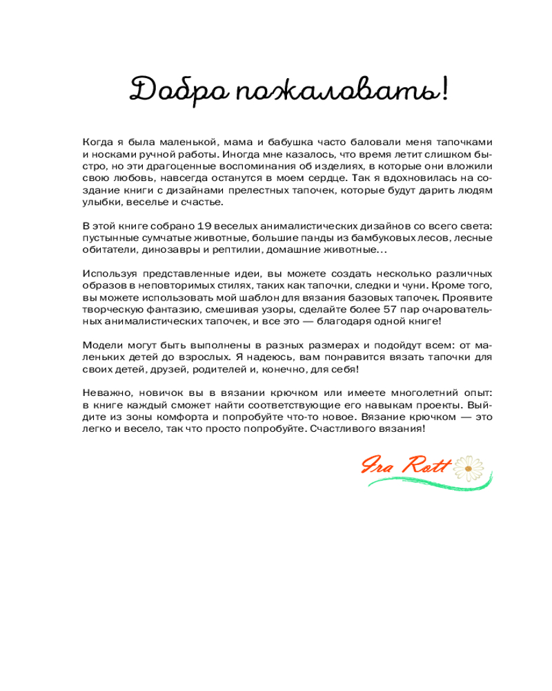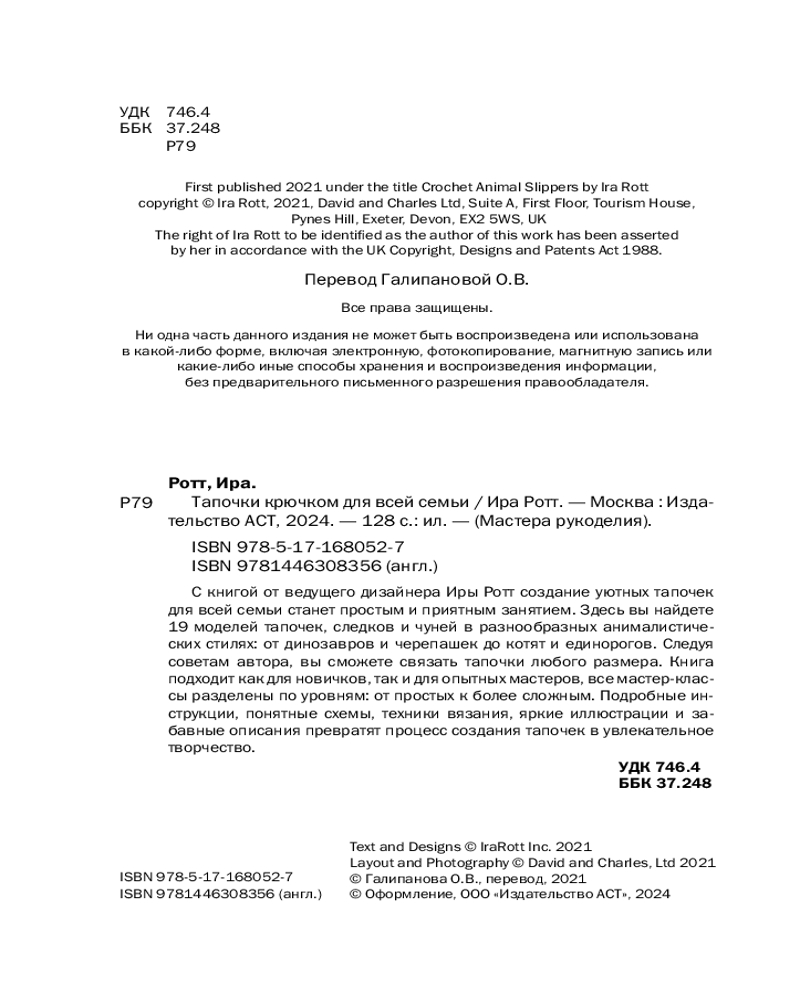 💳 Оплатить за товар можно при получении 🇰🇿 Есть бесплатная доставка по Казахстану от 1 дня 🎁 Копите бонусы с каждой покупки Серия: Мастера рукоделия Ира Ротт — канадский дизайнер, художница и автор книг по вязанию крючком. Ее самая большая страсть — создание мотивов и узоров, вдохновленных животным миром и природой. Вы сможете связать целую коллекцию из разнообразных тапочек, следков и чуней в анималистическом стиле для всей семьи. Книга подходит как для новичков, так и для опытных мастеров, все мастер-классы разделены по уровням: от простых к более сложным. |