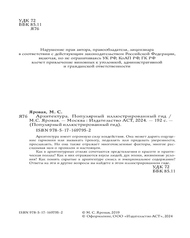 💳 Оплатить за товар можно при получении 🇰🇿 Есть бесплатная доставка по Казахстану от 1 дня 🎁 Копите бонусы с каждой покупки Серия: Популярный иллюстрированный гид Архитектура имеет огромную силу воздействия. Она может подарить ощущение гармонии или вызвать тревогу, подавлять или придавать уверенности, прославлять. Но она также отражает многочисленные факторы, многое рассказывая нам о прошлом и настоящем. Как в архитектурных стилях сочетаются представления о красоте и практическая польза? Как в них отражаются вкусы людей, дух эпохи, жизненные условия? Как понять скрытые в архитектуре смысл и эмоциональное содержание? Ответы на эти и другие вопросы вы найдете в этом иллюстрированном гиде. |