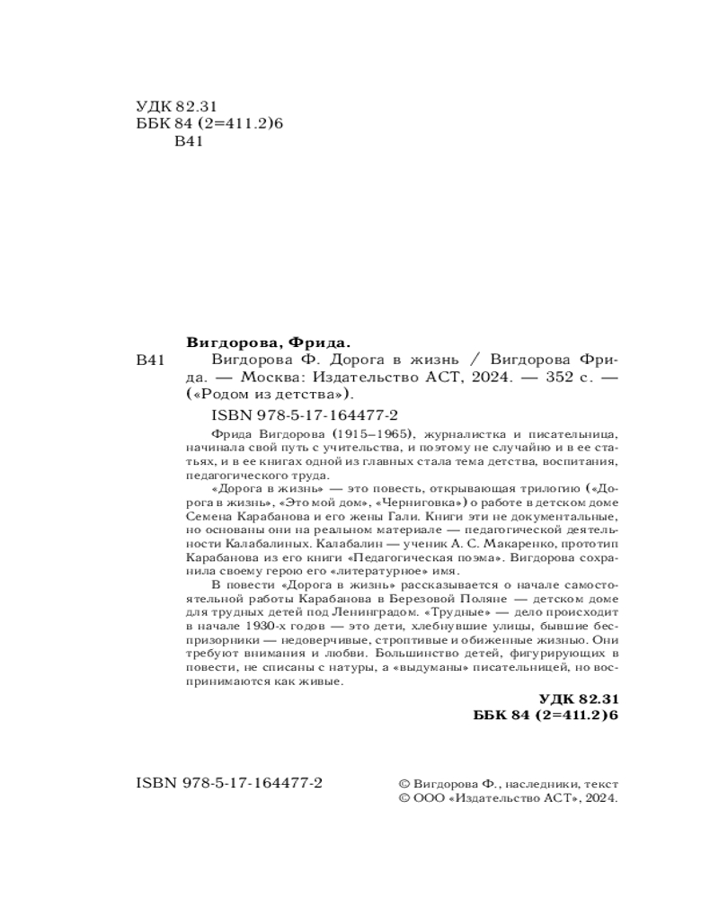 💳 Оплатить за товар можно при получении 🇰🇿 Есть бесплатная доставка по Казахстану от 1 дня 🎁 Копите бонусы с каждой покупки Серия: Родом из детства Фрида Вигдорова, журналистка и писательница, начинала свой путь с учительства, и поэтому не случайно и в ее статьях, и в ее книгах одной из главных стала тема детства, воспитания, педагогического труда. «Дорога в жизнь» — это повесть, открывающая трилогию («Дорога в жизнь», «Это мой дом», «Черниговка») о работе в детском доме Семена Карабанова и его жены Гали. Книги эти не документальные, но основаны они на реальном материале — педагогической деятельности Калабалиных. Калабалин — ученик А. С. Макаренко, прототип Карабанова из его книги «Педагогическая поэма». Вигдорова сохранила своему герою его «литературное» имя. |