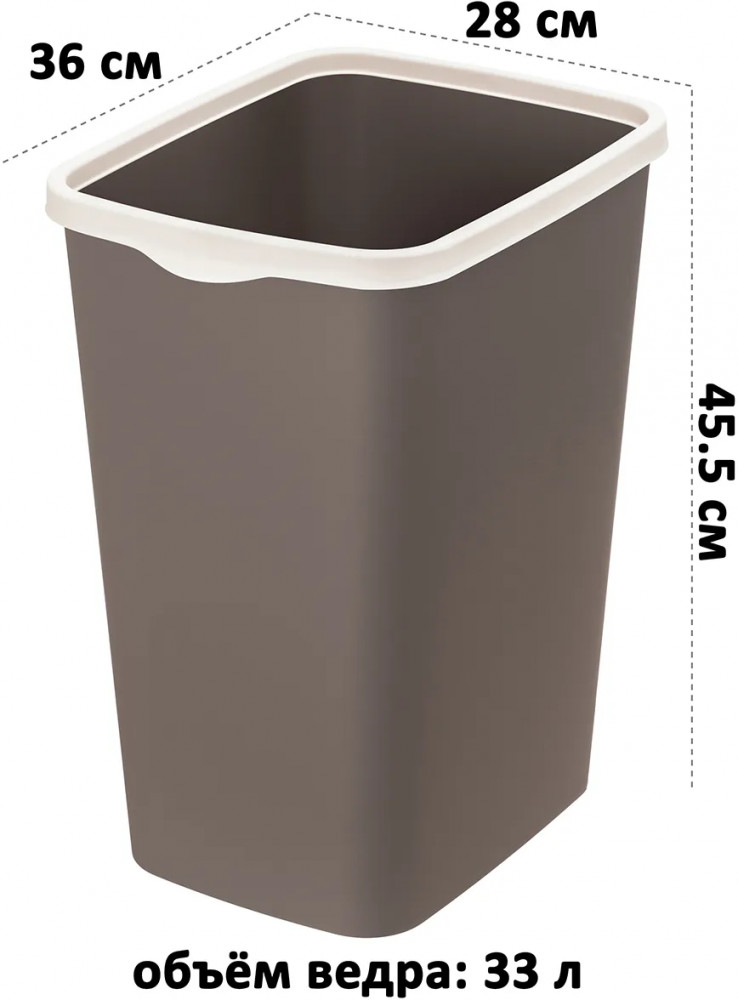 Ведро для мусора с фиксатором поможет поддерживать чистоту в вашем доме, офисе или на улице. Мусорное ведро выполнено из полипропилена. Этот вид пластика считается наиболее безопасным, так как не содержит бисфенол А и не выделяет вредных веществ. Мусорное ведро прямоугольной формы в шоколадном оттенке с фиксатором цвета слоновой кости можно разместить в ванной комнате, туалете или на кухне. Удобный держатель в виде ободка помогает зафиксировать мусорный пакет на ведре и не даёт ему сползать. Поставьте урну из пластика на пол возле раковины, стола или в хозяйственный шкаф.