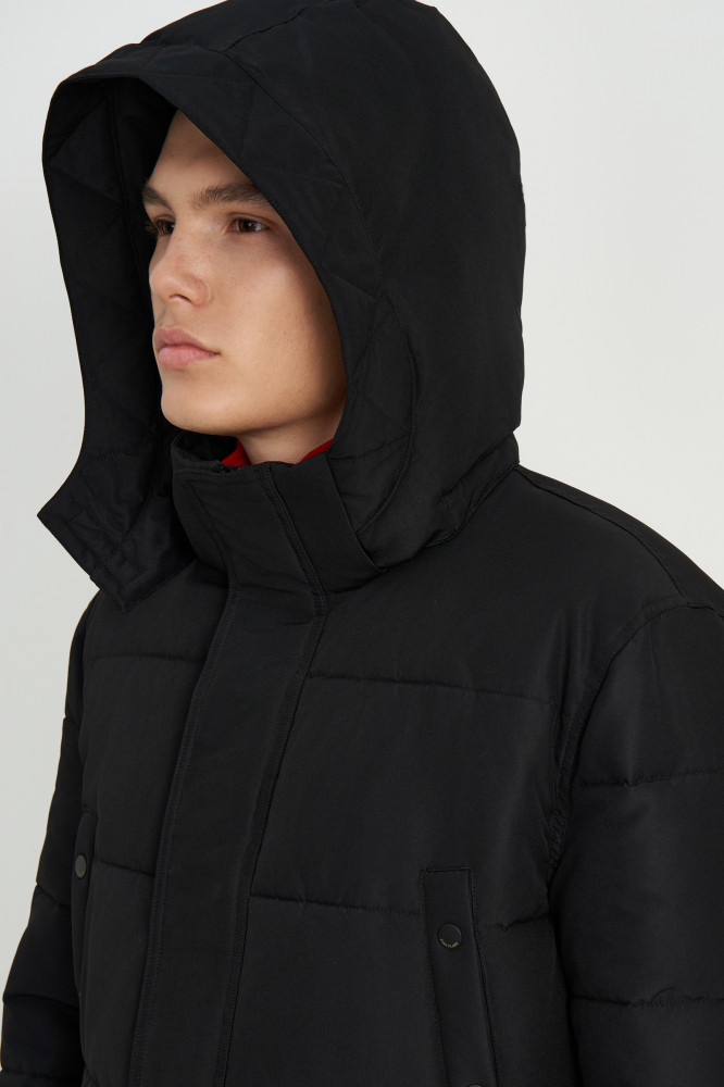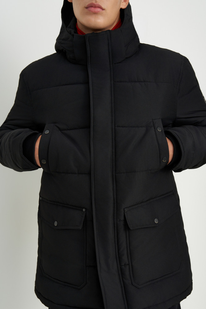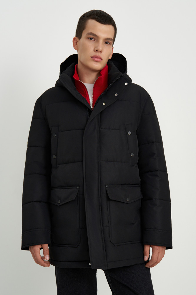 Утеплённая куртка выполнена из прочной плащевой ткани с водоотталкивающей и ветрозащитной пропитками, термополиуретановое покрытие добавляет дополнительную защиту от непогоды. Внутри — утеплитель DownFill, легкий и экологичный аналог натурального пуха. Регулируемый съемный капюшон, воротник-стойка и вязаные манжеты — детали, призванные защищать от холода и пронизывающего ветра. На рукаве есть лаконичное брендирование.
