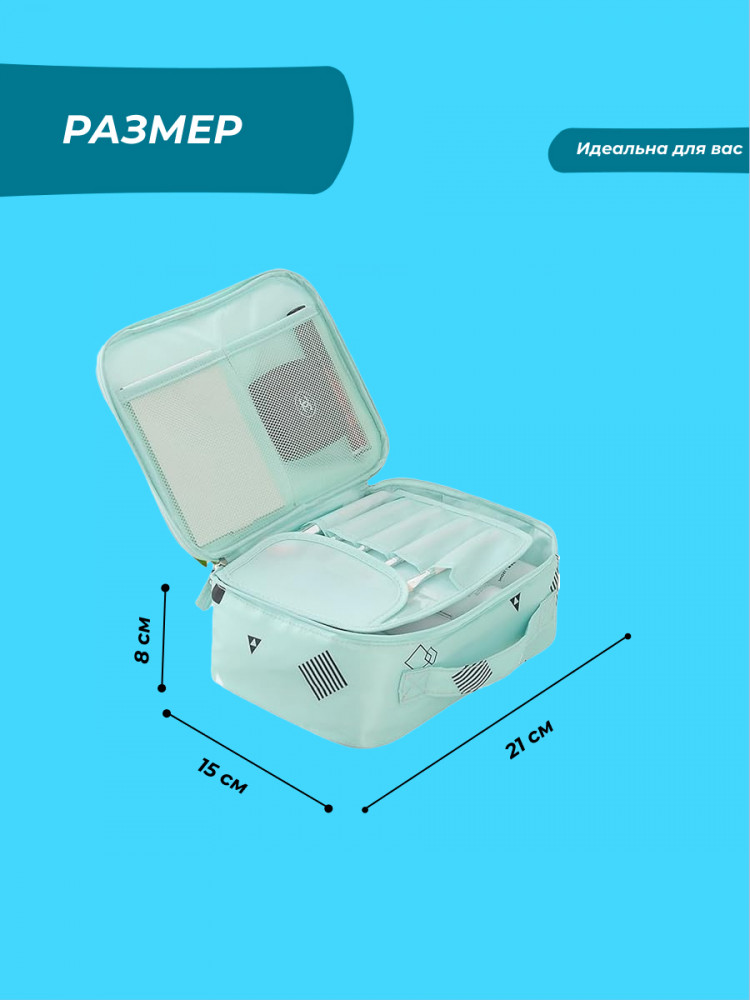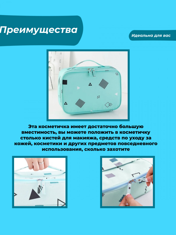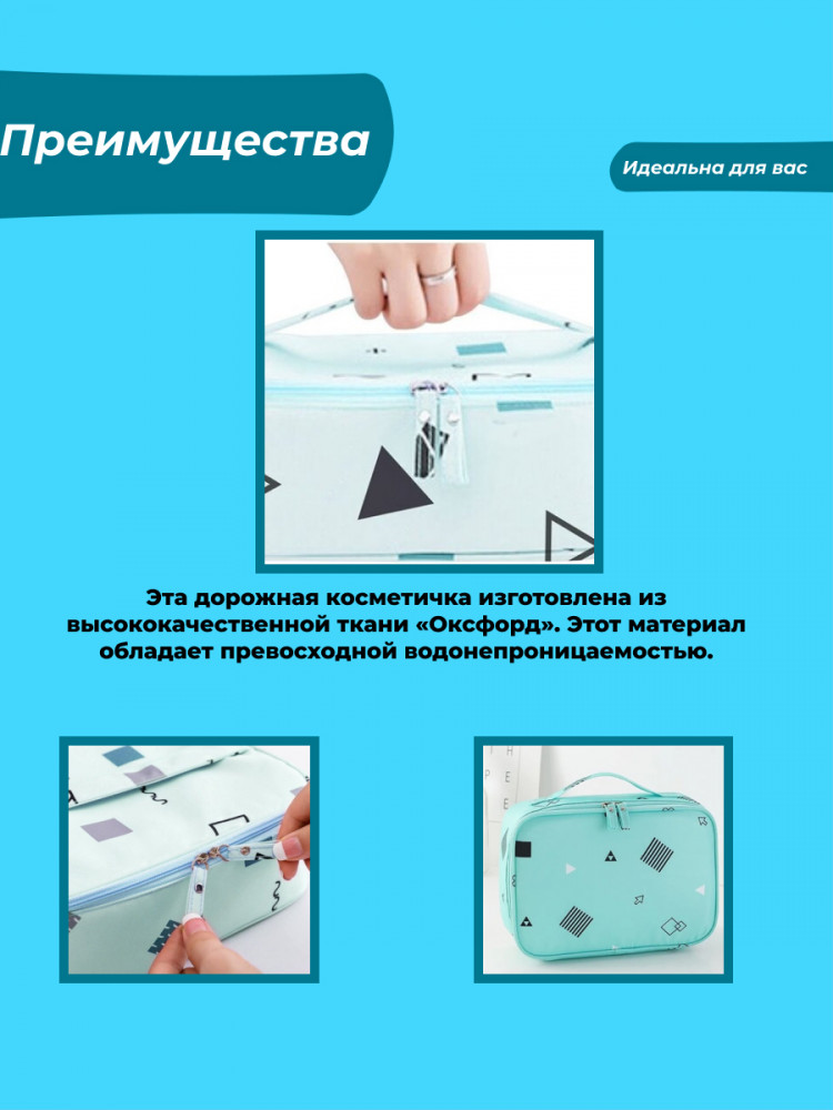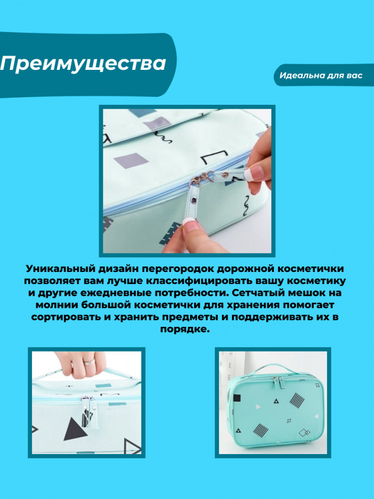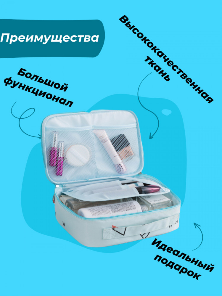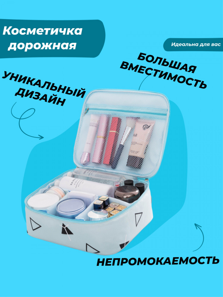 Держите всю косметику в одном месте! Большая дорожная косметичка органайзер из качественного водонепроницаемого материала. Прекрасный вариант для повседневного использования и незаменимая вещь в поездках на отдых, в командировки для мужчин и женщин. Прямоугольная форма позволяет компактно разместить её в дорожной сумке, в поездке на отдых всей семьей, когда экономия места имеет большое значение. Многие покупатели используют в качестве аптечки в поездках и дома. Нижнее отделение позволяет удобно разместить всю косметику: тональный крем, пудра, спреи, помада, блеск для губ, флаконы с различной косметикой. В верхней части несессера есть удобный карман из плотной сетки, прекрасно подойдет для кистей, карандашей, тюбиков с кремами, помады.
