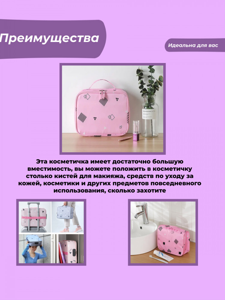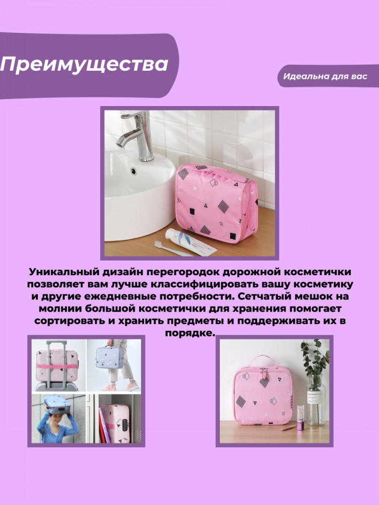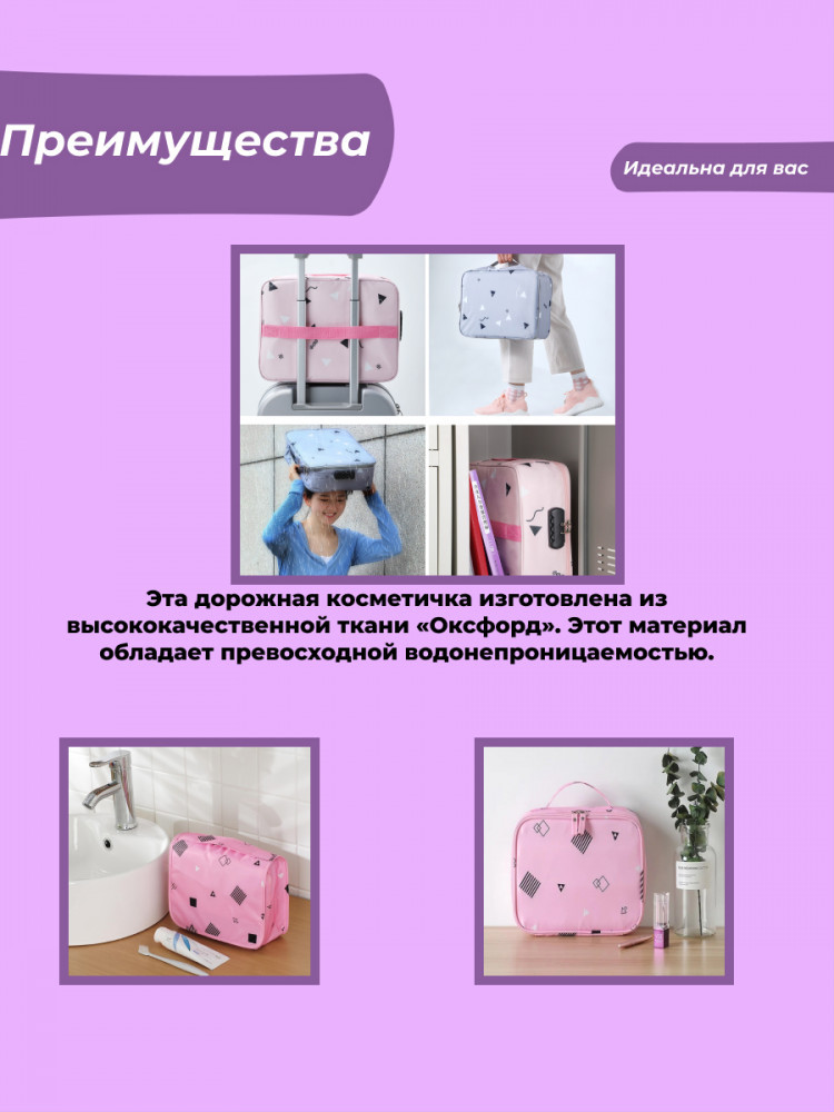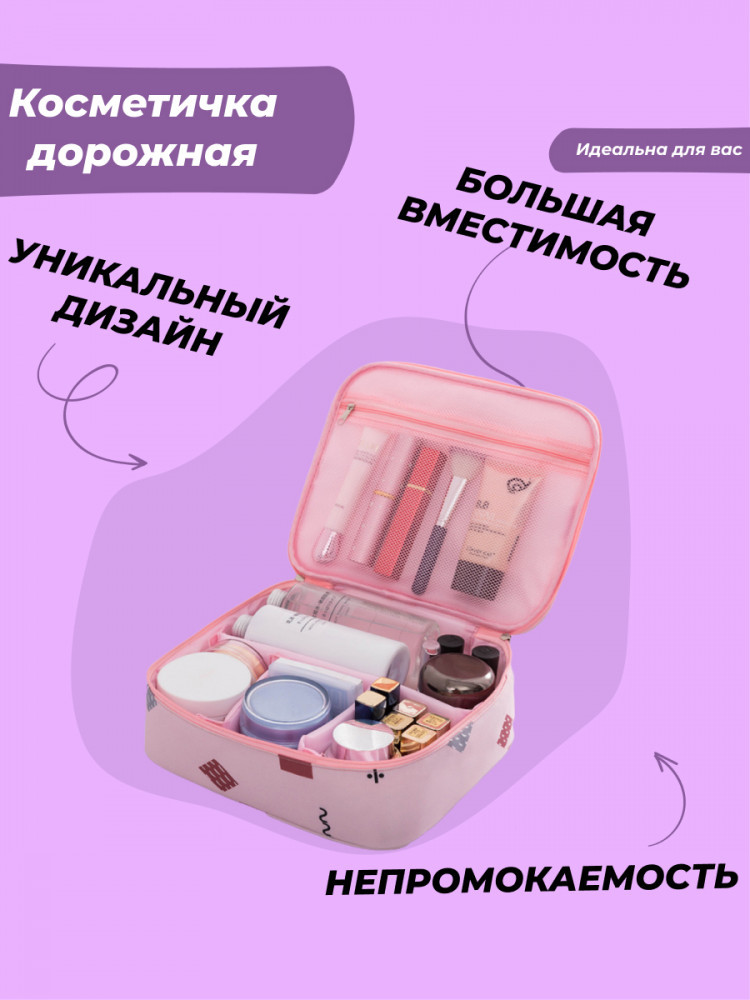 Держите всю косметику в одном месте! Большая дорожная косметичка органайзер из качественного водонепроницаемого материала. Прекрасный вариант для повседневного использования и незаменимая вещь в поездках на отдых, в командировки для мужчин и женщин. Прямоугольная форма позволяет компактно разместить её в дорожной сумке, в поездке на отдых всей семьей, когда экономия места имеет большое значение. Многие покупатели используют в качестве аптечки в поездках и дома. Нижнее отделение позволяет удобно разместить всю косметику: тональный крем, пудра, спреи, помада, блеск для губ, флаконы с различной косметикой. В верхней части несессера есть удобный карман из плотной сетки, прекрасно подойдет для кистей, карандашей, тюбиков с кремами, помады.