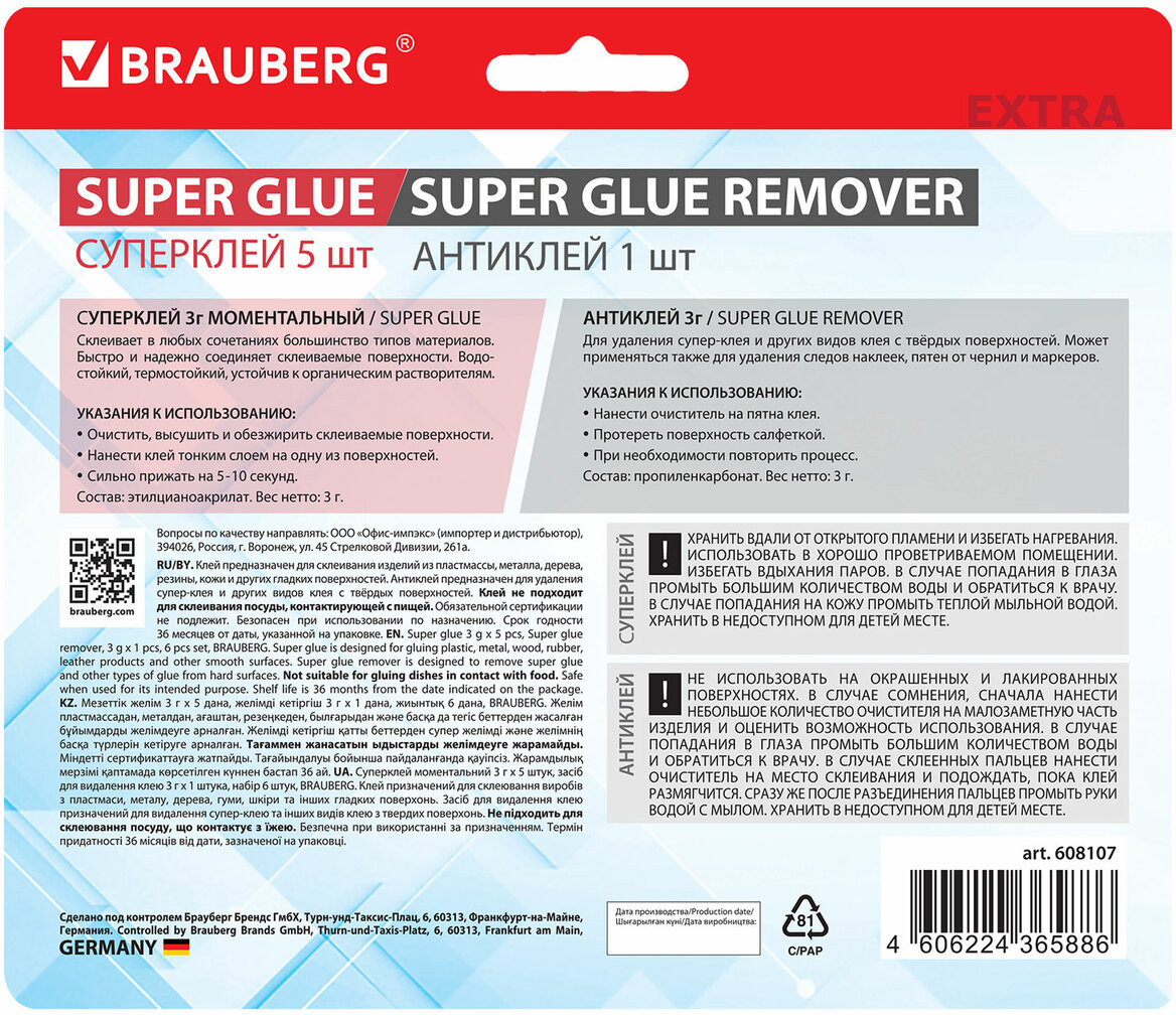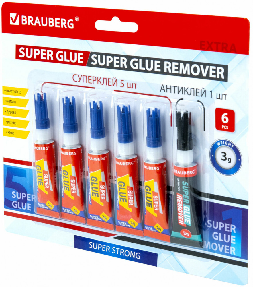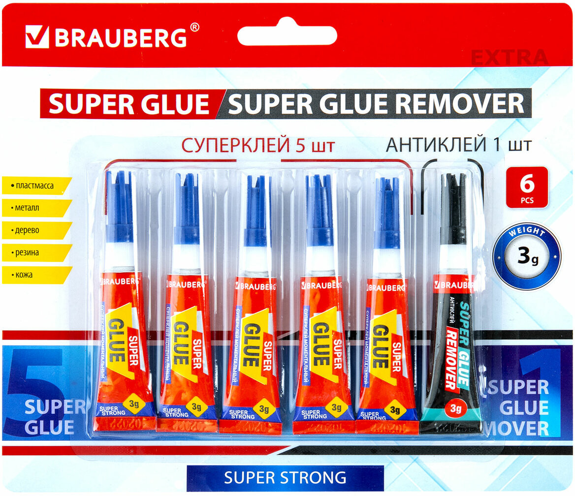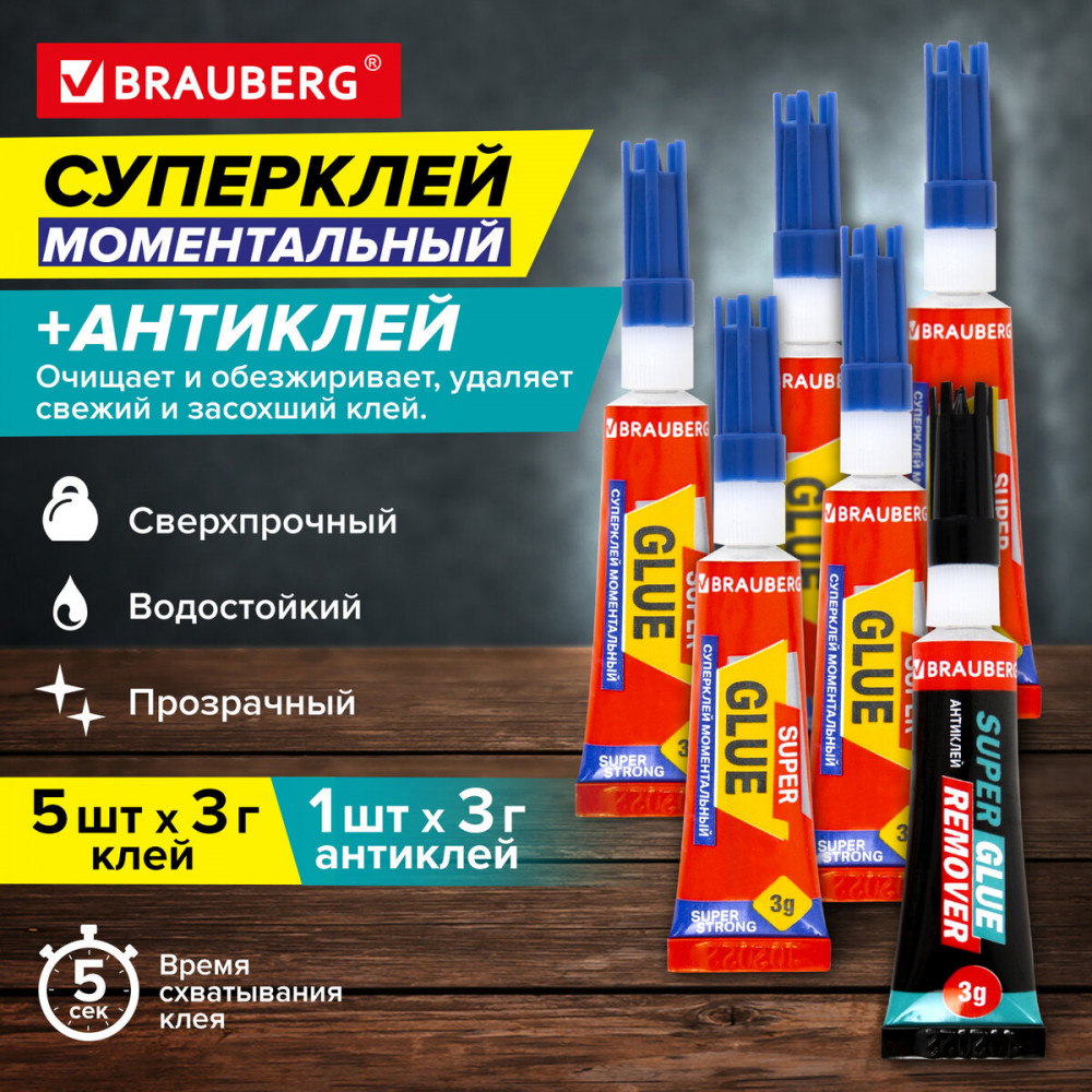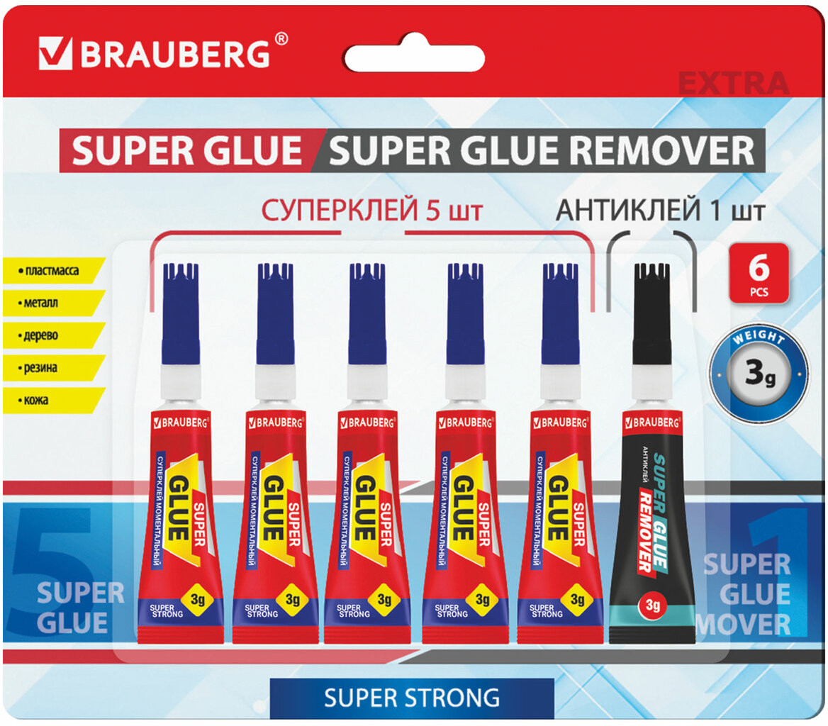 Набор «Клей моментальный Суперклей 5 шт. + «Антиклей 1 шт.» Brauberg Extra незаменим в быту! Применяется для склеивания изделий из пластмассы, дерева, резины, кожи и других материалов.