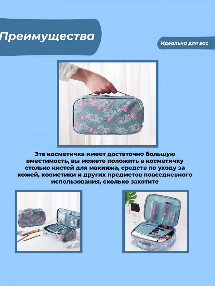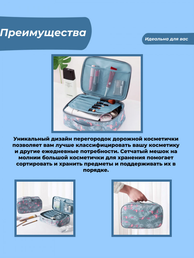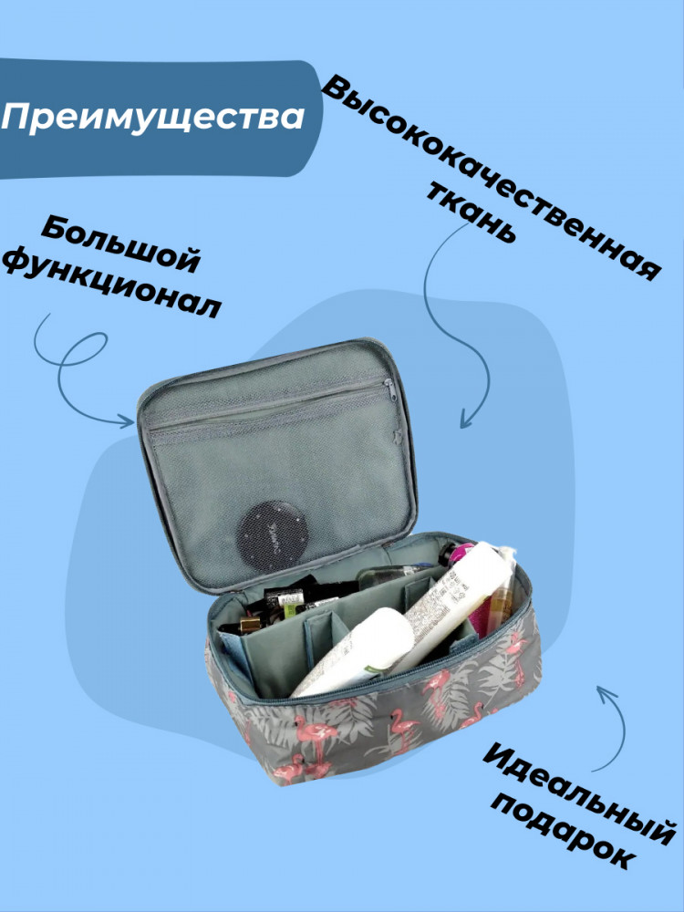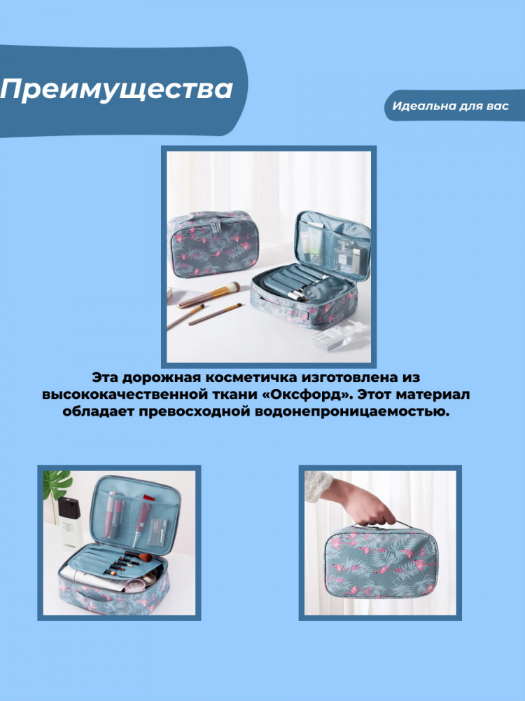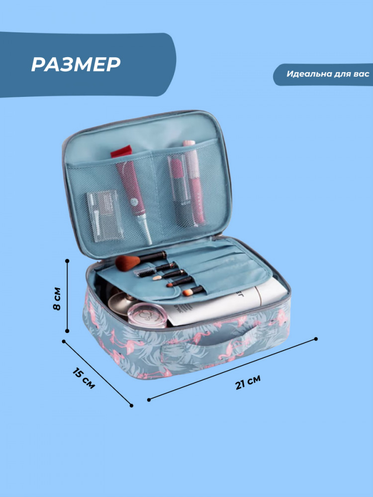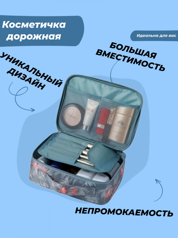Держите всю косметику в одном месте! Большая дорожная косметичка органайзер из качественного водонепроницаемого материала. Прекрасный вариант для повседневного использования и незаменимая вещь в поездках на отдых, в командировки для мужчин и женщин. Прямоугольная форма позволяет компактно разместить её в дорожной сумке, в поездке на отдых всей семьей, когда экономия места имеет большое значение. Многие покупатели используют в качестве аптечки в поездках и дома. Нижнее отделение позволяет удобно разместить всю косметику: тональный крем, пудра, спреи, помада, блеск для губ, флаконы с различной косметикой. В верхней части несессера есть удобный карман из плотной сетки, прекрасно подойдет для кистей, карандашей, тюбиков с кремами, помады.