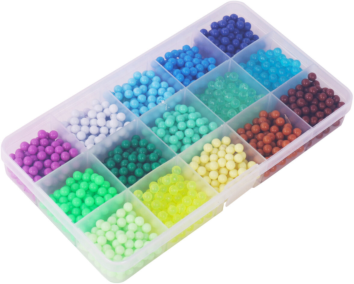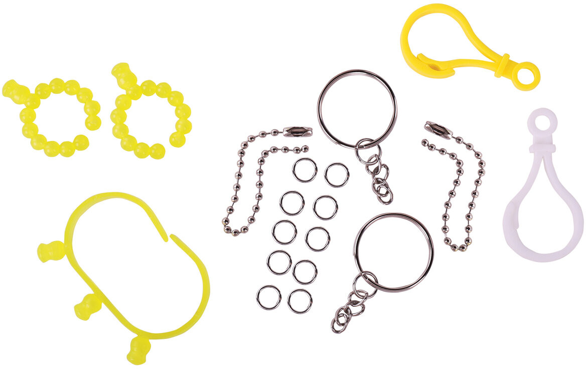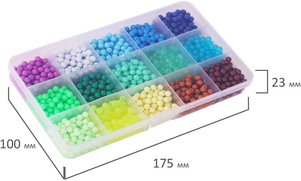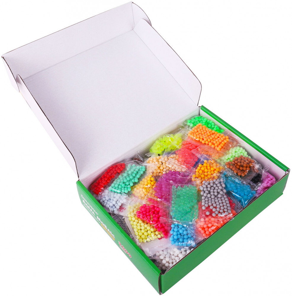 В набор входят бусины 30 различных цветов, около 100 штук каждого цвета, 2 пластиковых контейнера с отсеками для удобного хранения бусин, 3 подставки-трафарета, 14 двусторонних карточек с картинками, бутылочка-пульверизатор для воды, специальная ручка для аквамозаики, лопатка для снятия готовой фигурки с трафарета, а также основы для браслета и других украшений, колечки и крепления для создания брелков, подвесок и других игрушек из бусин. Диаметр одной бусины — 0,5 см.