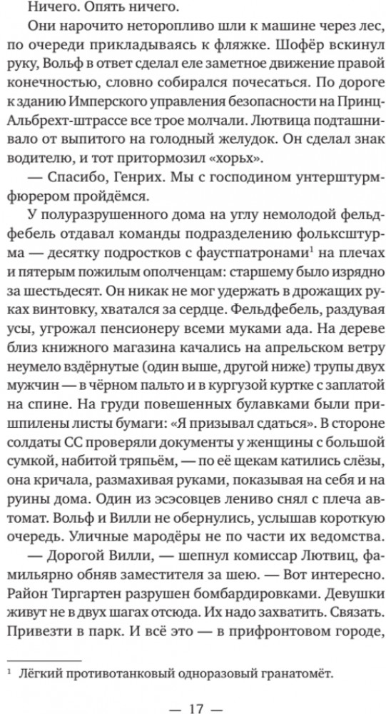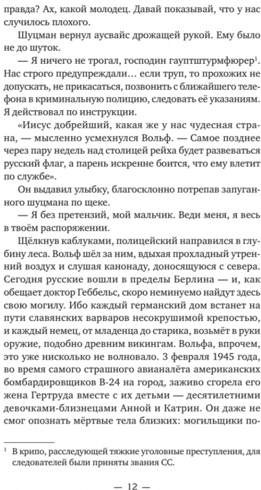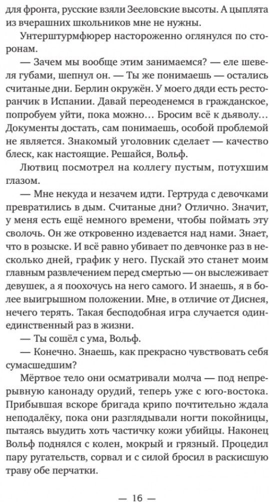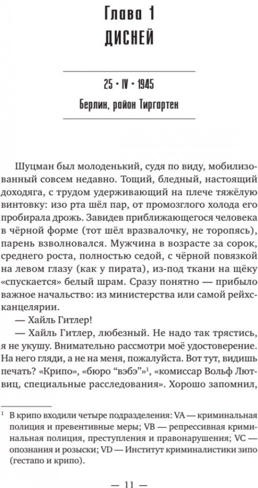 💳 Оплатить за товар можно при получении 🇰🇿 Есть бесплатная доставка по Казахстану от 1 дня 🎁 Копите бонусы с каждой покупки В этом романе рассказано всего об одной неделе — с 25 апреля по 1 мая 1945 года. До капитуляции нацистской армии в Берлине остаётся несколько дней. На фоне ожесточённых боёв в столице Германии происходят шокирующие события. Неизвестный маньяк переодевает девушек в платья сказочных персонажей и охотится за ними в центральном парке столицы Третьего рейха. Своих жертв он находит и в районах, освобожденных Красной Армией, и в городских кварталах, ещё занятых вермахтом и СС. Советский следователь Сергей Комаровский, отлично владеющий немецким языком, переодевшись в форму СС, проникает в зону, контролируемую врагом, чтобы добраться до убийцы. Ему придётся сражаться не только с солдатами Гитлера, но и столкнуться со своим коллегой из криминальной полиции рейха, также пытающимся задержать маньяка. |