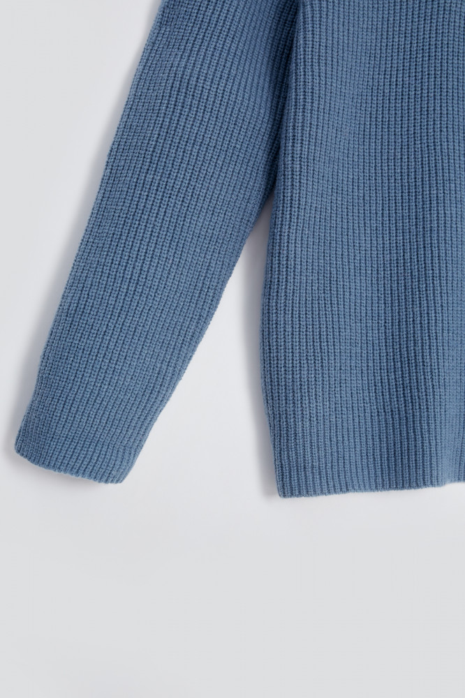 Большемерит. Цвет не голубой, ближе к цвету "петроль" или тёмный цвет "морская волна".В составе 10% шерсти, остальное синтетика. Пока всё устраивает, посмотрим, как поведёт себя после стирки и в дальнейшей носке.