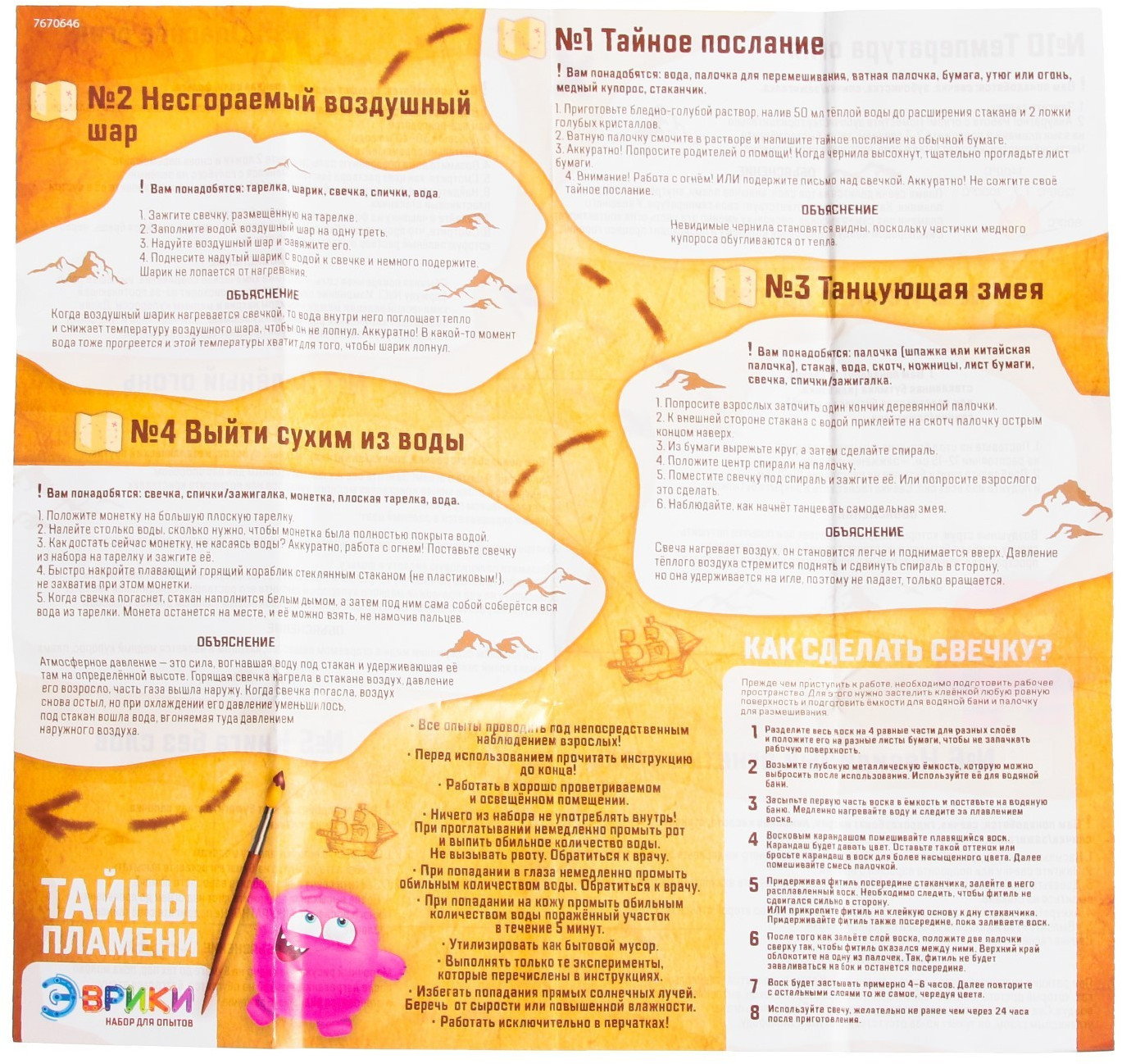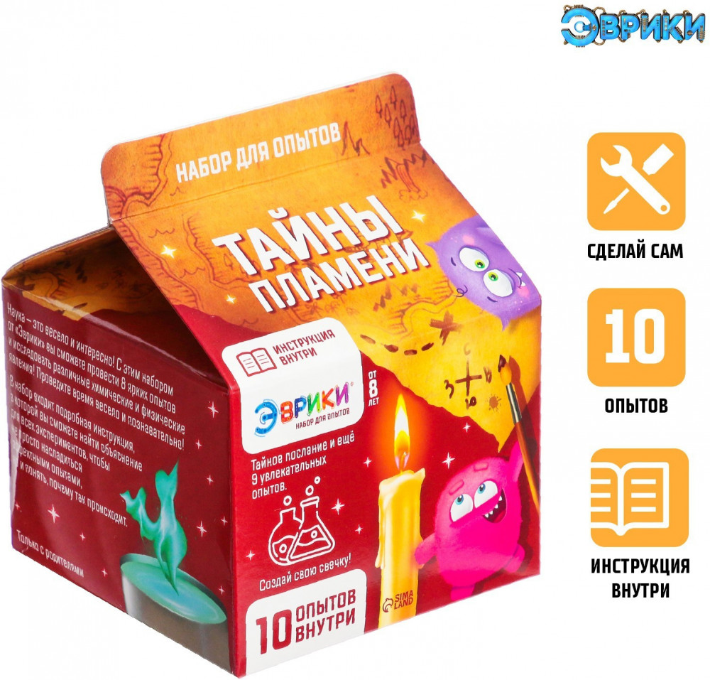 С набором для опытов «Тайны пламени» ребёнок узнает об удивительных свойствах веществ, проведёт 10 огненных экспериментов и удивит друзей. Прежде чем приступать к экспериментам, необходимо подготовить рабочее пространство. В инструкции есть пошаговое описание, как создать свечку, которая вам понадобится для проведения экспериментов. Каждый опыт имеет пошаговую инструкцию и объяснения.