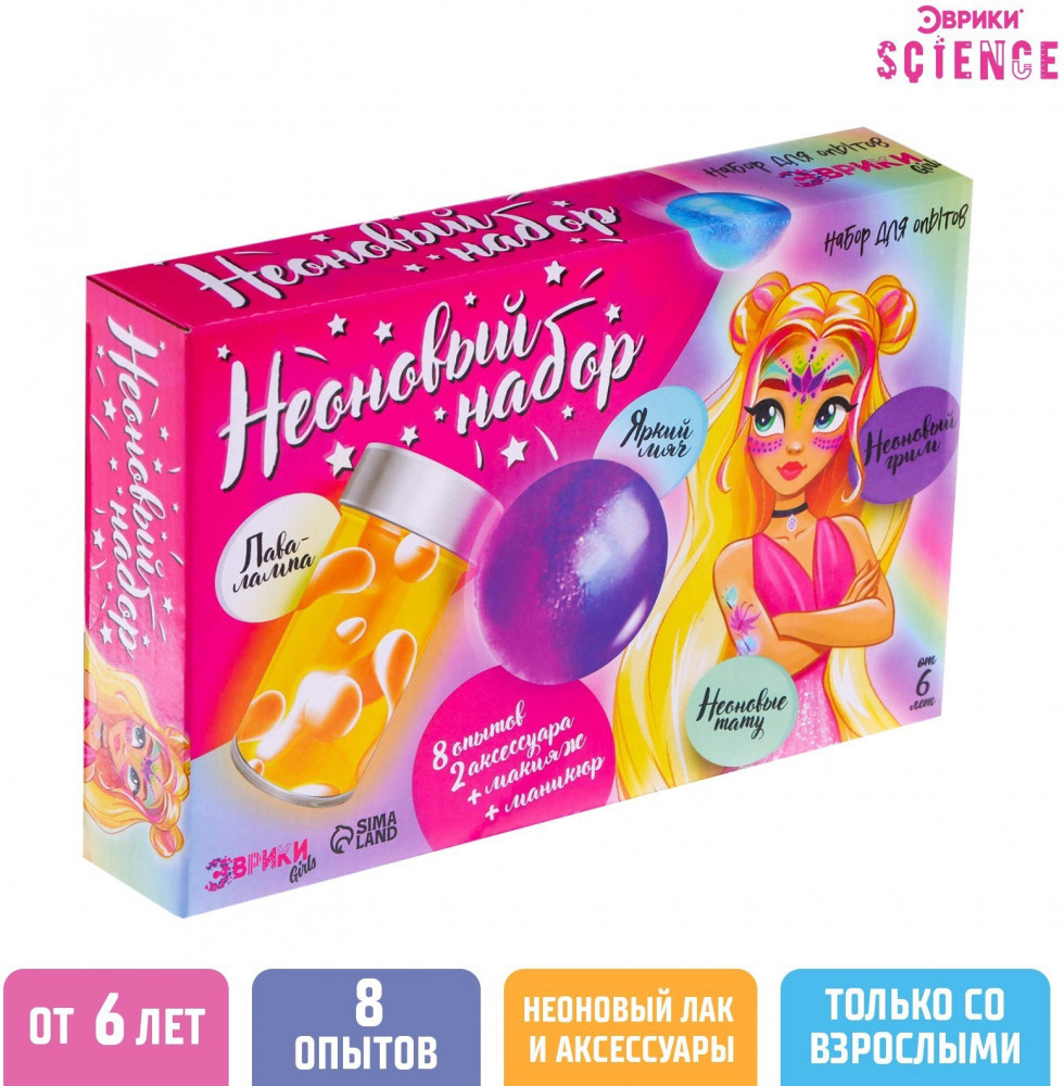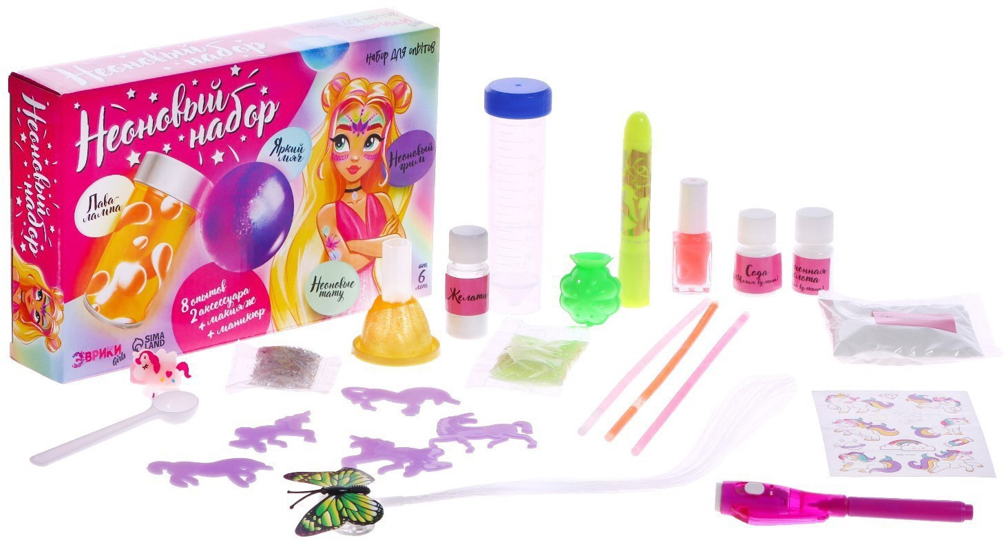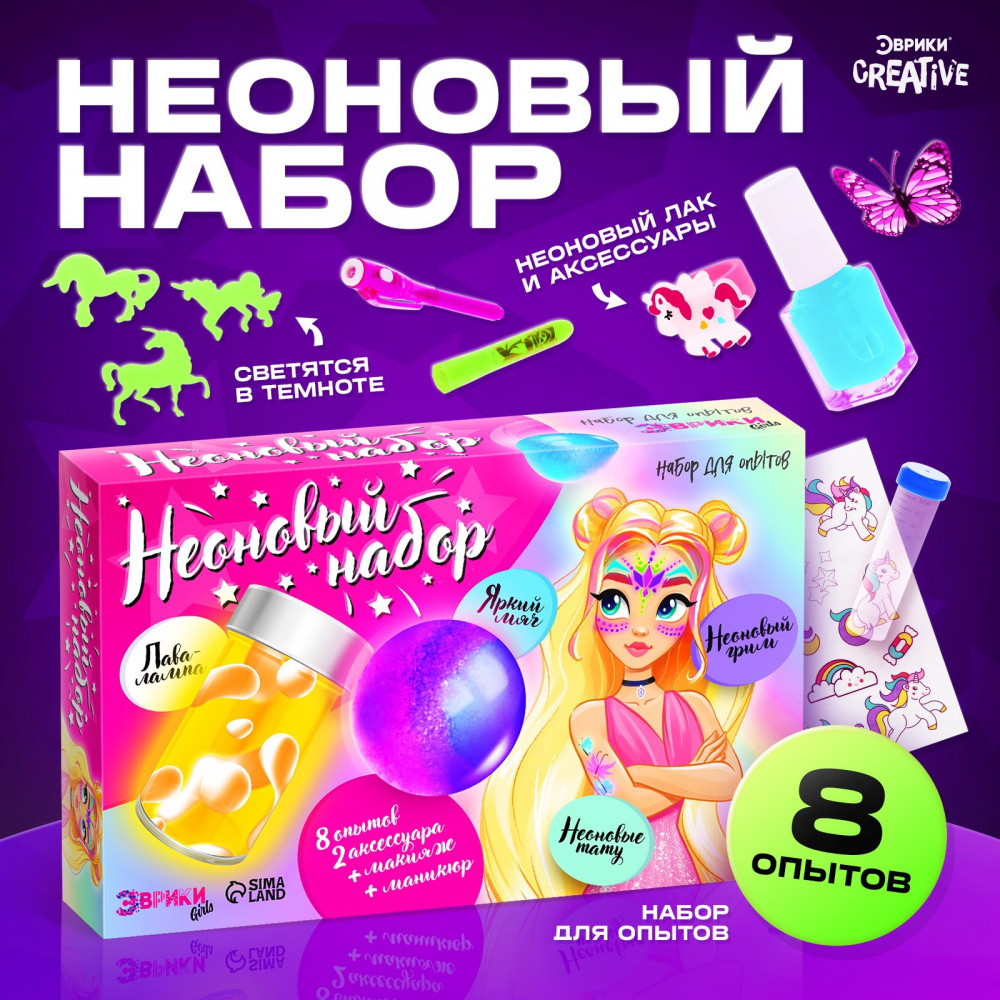 Набор для опытов «Неоновый набор» ребёнок проведёт 8 интересных экспериментов, в результате которых у малышки появятся необычные игрушки. А также сделает красивый макияж и необычный маникюр.