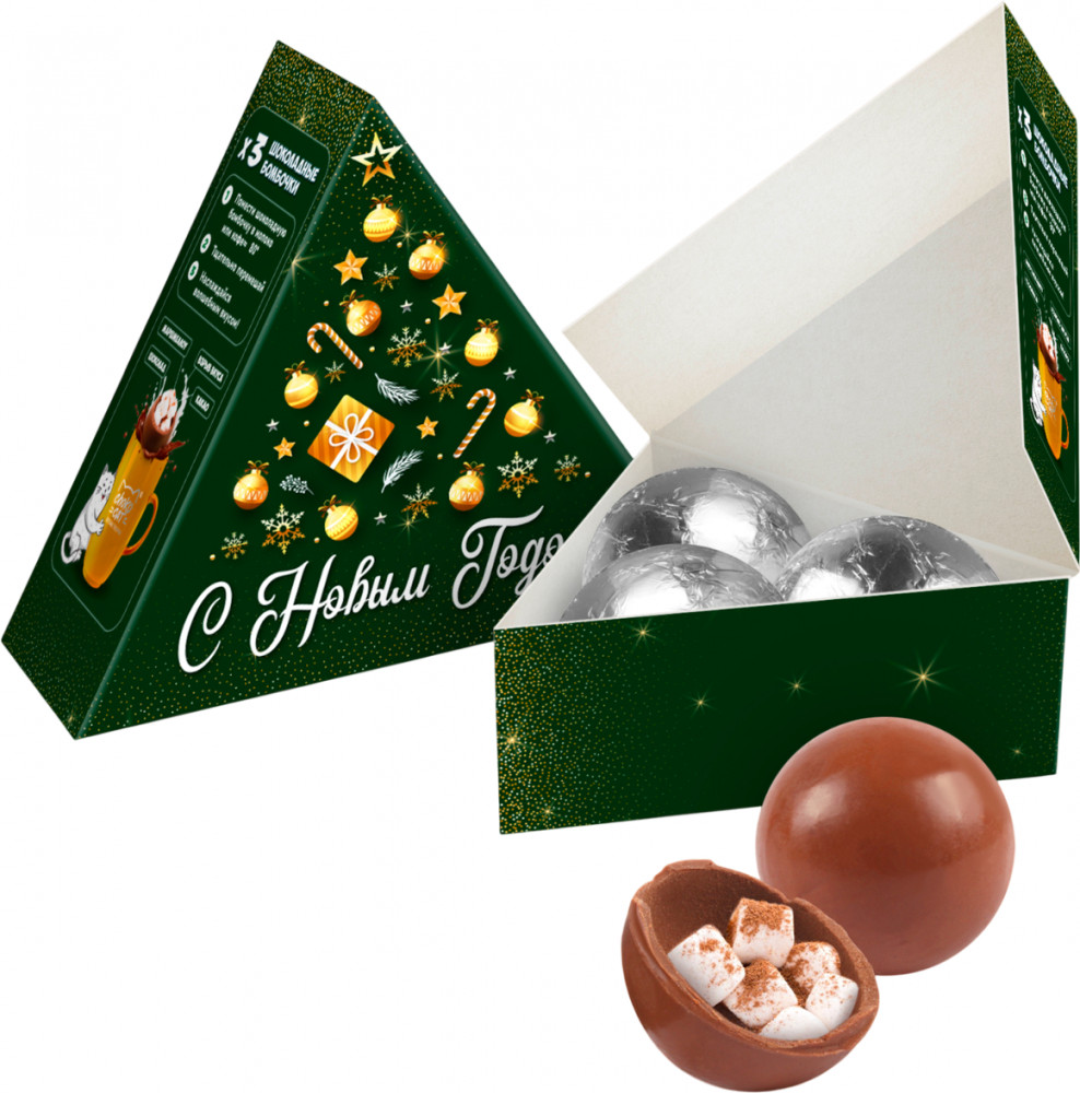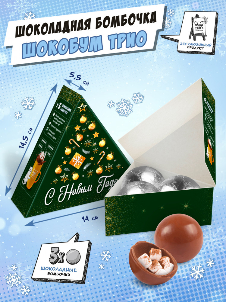 ChokoCat Набор шоколадных бомбочек с маршмеллоу «Золотая елка»В данный момент этот товар отсутствует в продаже. Возможно, у нас найдется аналогичный или похожий товар здесь. Набор из трех шоколадных бомбочек с маршмеллоу в треугольной упаковке. Приготовление какао из бомбочек максимально просто, инструкция с картинками по приготовлению находится на упаковке. |
