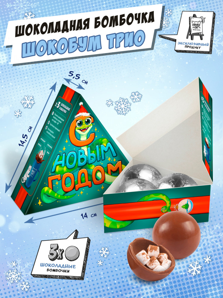 ChokoCat Набор шоколадных бомбочек с маршмеллоу «Сможешь все, змейка»В данный момент этот товар отсутствует в продаже. Возможно, у нас найдется аналогичный или похожий товар здесь. Набор из трех шоколадных бомбочек с маршмеллоу в треугольной упаковке. Приготовление какао из бомбочек максимально просто, инструкция с картинками по приготовлению находится на упаковке. |
