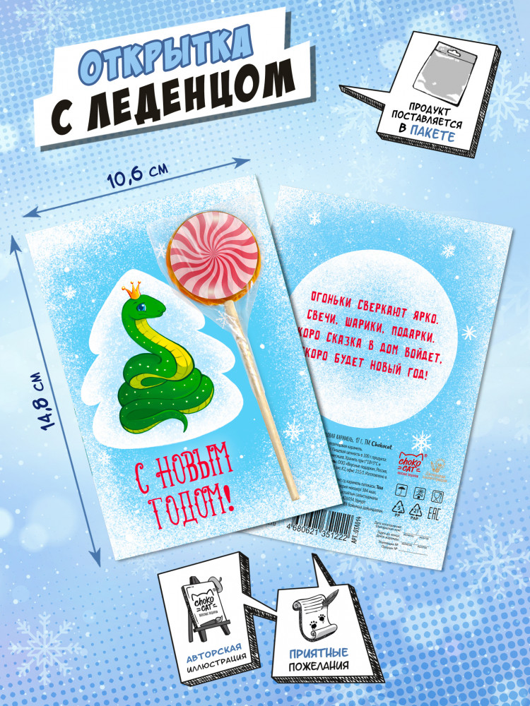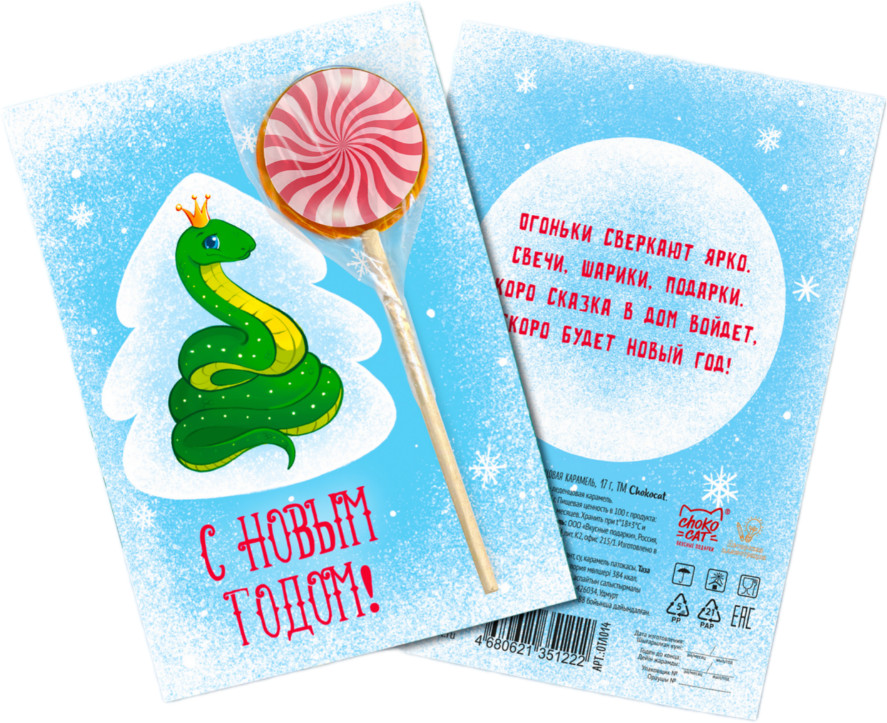 ChokoCat Открытка с леденцом «Ледяная змея»В данный момент этот товар отсутствует в продаже. Возможно, у нас найдется аналогичный или похожий товар здесь. Серия: Открытка с леденцом Огоньки сверкают ярко, свечи, шарики, подарки. Скоро сказка в дом войдет, скоро будет Новый год. |