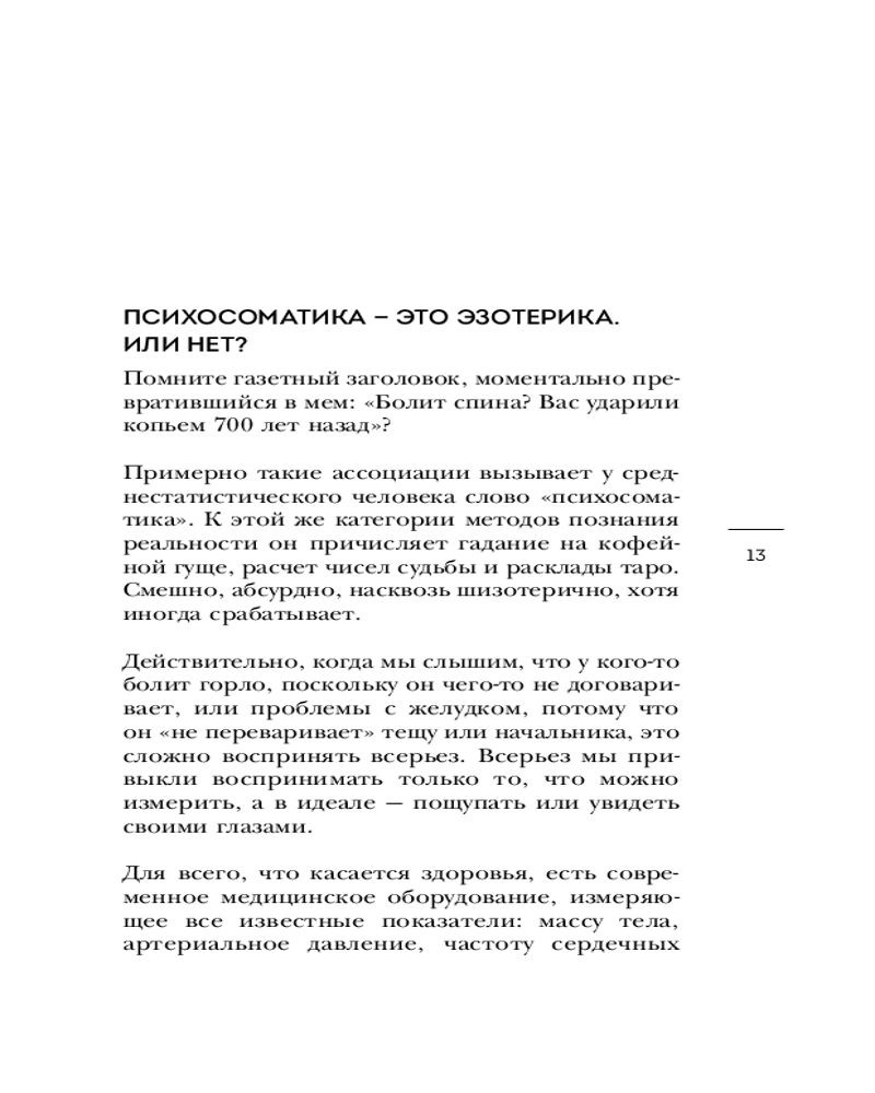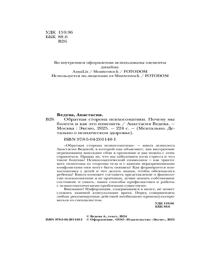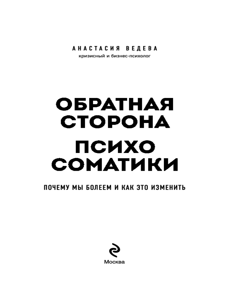 | Анастасия Ведева — кризисный и бизнес-психолог. В этой книге она рассматривает психосоматику как комплексное явление, которое сочетает в себе физиологическую и психическую стороны, и благодаря которому можно лучше понять истинные причины той или иной болезни. |