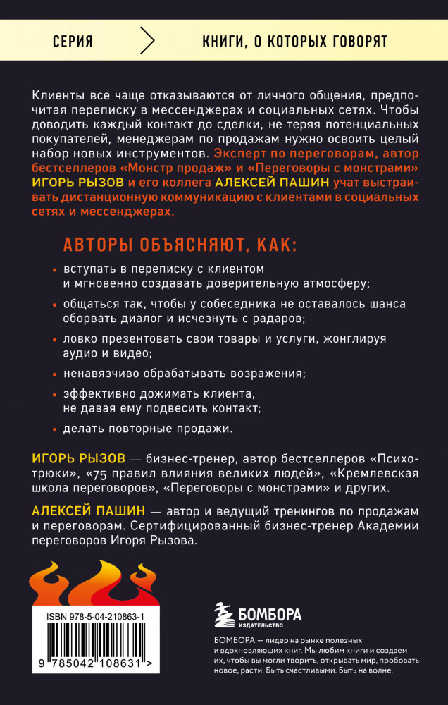 💳 Оплатить за товар можно при получении 🇰🇿 Есть бесплатная доставка по Казахстану от 1 дня 🎁 Копите бонусы с каждой покупки Серия: Книги, о которых говорят Львиная доля переговоров о продажах переместилась в мессенджеры и социальные сети. Там клиенты спрашивают о цене, уточняют наличие товара, просят скидку и бесследно исчезают, если их что-то не устроило. Ведущий эксперт по переговорам Игорь Рызов и его коллега Алексей Пашин предлагают систему эффективных принципов и правил общения с потенциальными покупателями через мессенджеры, эсэмэс-сообщения и директы социальных сетей. |