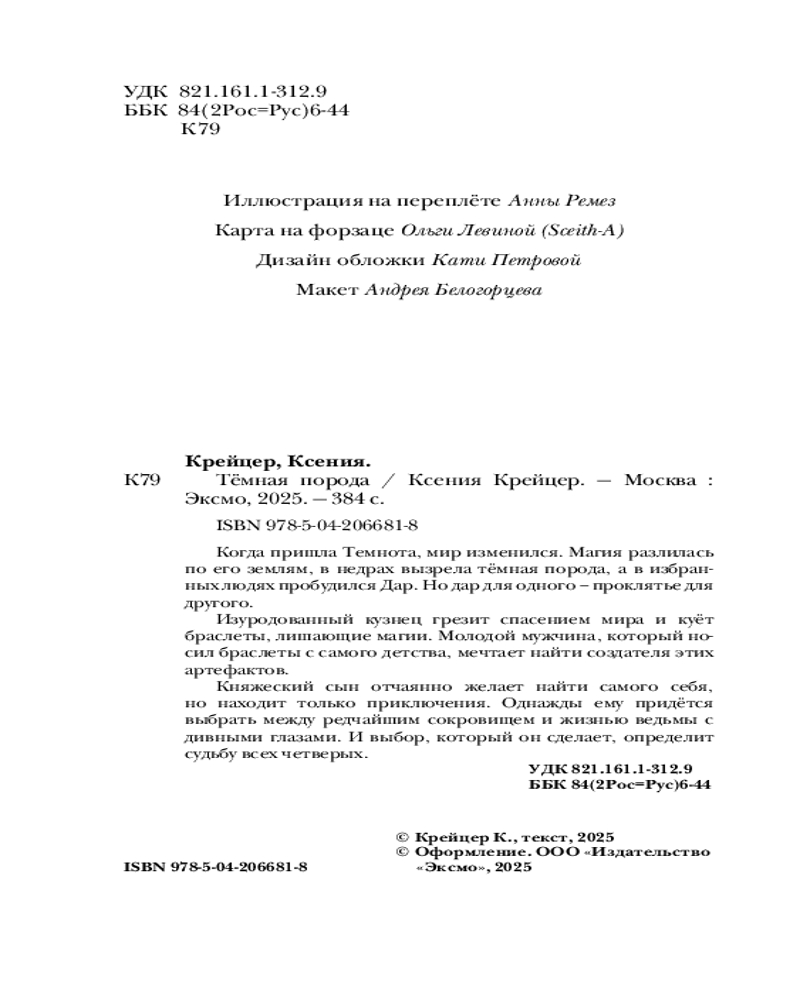 💳 Оплатить за товар можно при получении 🇰🇿 Есть бесплатная доставка по Казахстану от 1 дня 🎁 Копите бонусы с каждой покупки Серия: Young Adult. Книжный бунт. Фантастика Когда пришла Темнота, мир изменился. Магия разлилась по его землям, в недрах вызрела тёмная порода, а в избранных людях пробудился Дар. Но дар для одного — проклятье для другого. Изуродованный кузнец грезит спасением мира и куёт браслеты, лишающие магии. Молодой мужчина, который носил браслеты с самого детства, мечтает найти создателя этих артефактов. Княжеский сын отчаянно желает найти самого себя, но находит только приключения. Однажды ему придётся выбрать между редчайшим сокровищем и жизнью ведьмы с дивными глазами. И выбор, который он сделает, определит судьбу всех четверых. |