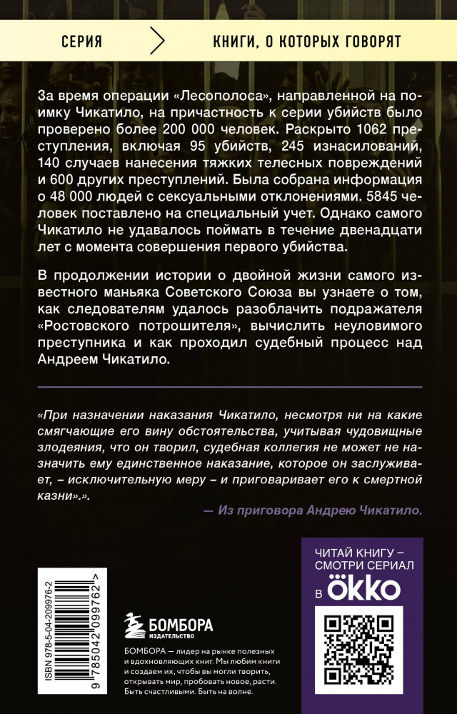 💳 Оплатить за товар можно при получении 🇰🇿 Есть бесплатная доставка по Казахстану от 1 дня 🎁 Копите бонусы с каждой покупки Серия: Книги, о которых говорят За время операции «Лесополоса», направленной на поимку Чикатило, на причастность к серии убийств было проверено более 200 000 человек. Раскрыто 1062 преступления, включая 95 убийств, 245 изнасилований, 140 случаев нанесения тяжких телесных повреждений и 600 других преступлений. Собрана информация на 48 000 человек с сексуальными отклонениями. 5845 человек поставлено на специальный учет. Однако самого Чикатило не удавалось поймать в течение двенадцати лет с момент совершения первого убийства. Продолжение истории о двойной жизни самого известного маньяка Советского Союза. Вы узнаете о том, как следователям удалось разоблачить подражателя «Ростовского потрошителя», вычислить неуловимого преступника и как проходил судебный процесс над Андреем Чикатило. |