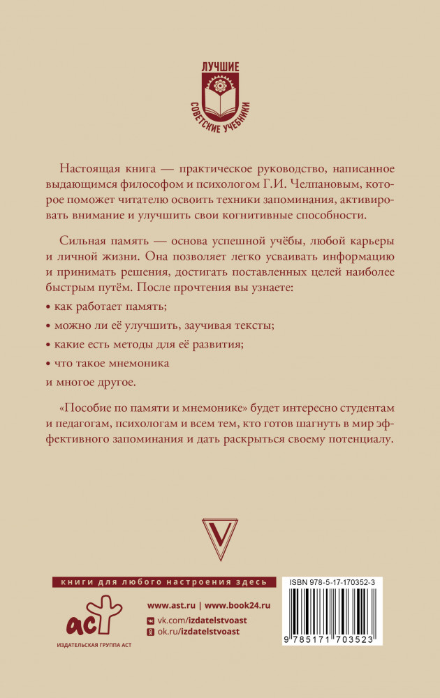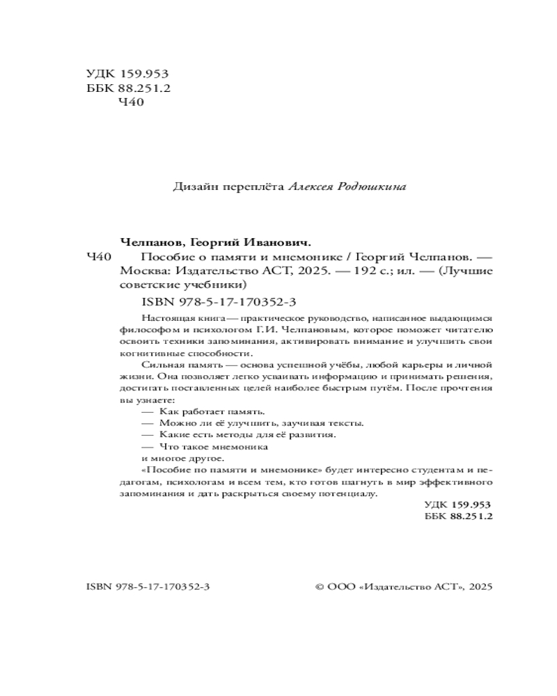 💳 Оплатить за товар можно при получении 🇰🇿 Есть бесплатная доставка по Казахстану от 1 дня 🎁 Копите бонусы с каждой покупки Серия: Лучшие советские учебники Настоящая книга — практическое руководство, написанное выдающимся философом и психологом Г.И. Челпановым, которое поможет читателю освоить техники запоминания, активировать внимание и улучшить свои когнитивные способности. Сильная память — основа успешной учёбы, любой карьеры и личной жизни. Она позволяет легко усваивать информацию и принимать решения, достигать поставленных целей наиболее быстрым путём. «Пособие по памяти и мнемонике» будет интересно студентам и педагогам, психологам и всем тем, кто готов шагнуть в мир эффективного запоминания и дать раскрыться своему потенциалу. |