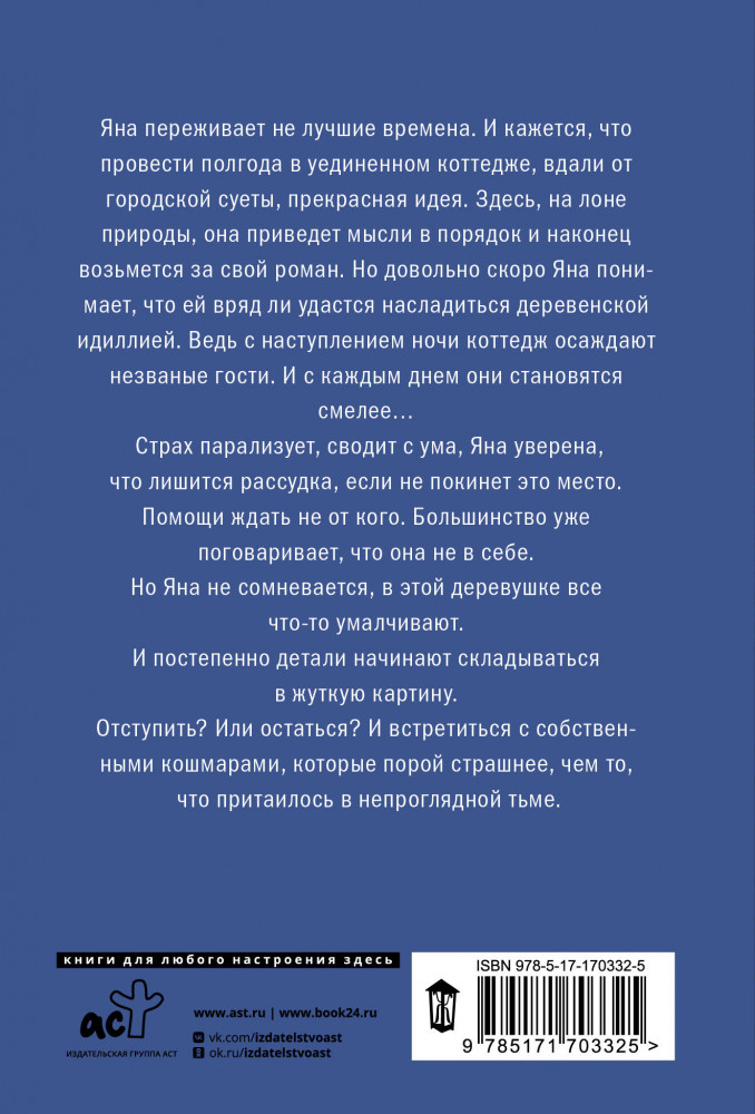 💳 Оплатить за товар можно при получении 🇰🇿 Есть бесплатная доставка по Казахстану от 1 дня 🎁 Копите бонусы с каждой покупки Серия: Объявлено убийство (м) Яна переживает не лучшие времена. И поначалу ей кажется, что провести полгода в уединенном коттедже, вдали от городской суеты, прекрасная идея. Здесь, на лоне природы, она приведет мысли в порядок и наконец возьмется за свой роман. Но довольно скоро Яна понимает, что ей вряд ли удастся насладиться деревенской идиллией. Ведь с наступлением ночи коттедж осаждают незваные гости. И с каждым днем они становятся смелее... |