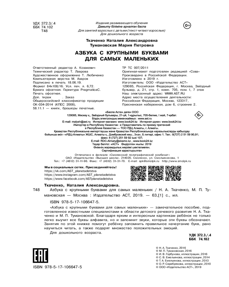 💳 Оплатить за товар можно при получении 🇰🇿 Есть бесплатная доставка по Казахстану от 1 дня 🎁 Копите бонусы с каждой покупки Серия: Раннее развитие «Азбука для самых маленьких» — замечательное пособие, подготовленное известными специалистами в области детского речевого развития Н. А. Ткаченко и М. П. Тумановской. Благодаря ярким и интересным картинкам ребёнок не только легко выучит все буквы алфавита, но и запомнит звуки, которые эти буквы обозначают. Занятия по этой книжке помогут ребёнку запомнить правильное начертание букв, рано научиться читать, а также подарят множество положительных эмоций. Для дошкольного возраста. |