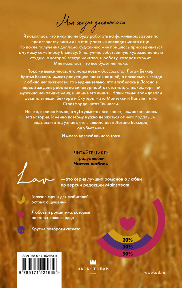 💳 Оплатить за товар можно при получении 🇰🇿 Есть бесплатная доставка по Казахстану от 1 дня 🎁 Копите бонусы с каждой покупки Серия: LAV. Романтика Моя жизнь закончилась. Я поклялась, что никогда не буду работать на фамильном заводе по производству виски и не стану частью наследия моего отца. Но после получения диплома художника мне пришлось присоединиться к чужому семейному бизнесу. Я получила собственную художественную студию, о которой всегда мечтала, и работу, которая кормит. Мне казалось, что все будет неплохо. Пока не выяснилось, что моим новым боссом стал Логан Беккер. Братья Беккеры имеют репутацию плохих парней, а поскольку я всегда любила неприятности, то неудивительно, что влюбилась в Логана в первый же день работы на винокурне. Этот статный, слишком горячий мужчина ненавидит меня, и не мне его винить. Наши семьи враждовали десятилетиями. Беккеры и Скутеры — это Монтекки и Капулетти из Стратфорда, штат Теннесси. Но что, если он Ромео, а я Джульетта? Все знают, чем закончилась эта история. Именно поэтому нужно держаться от него подальше. Ведь если отец узнает, что я влюбилась в Логана Беккера,он убьет меня. И моего возлюбленного тоже. |