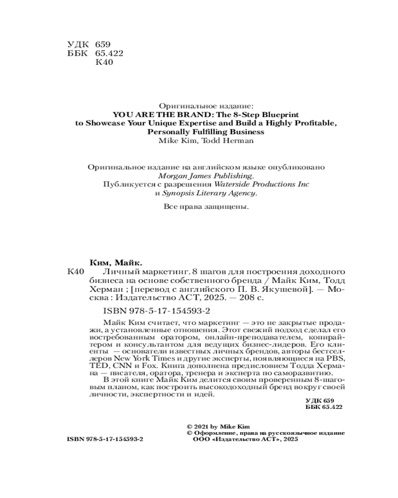 💳 Оплатить за товар можно при получении 🇰🇿 Есть бесплатная доставка по Казахстану от 1 дня 🎁 Копите бонусы с каждой покупки Серия: Бизнес тренды Майк Ким считает, что маркетинг — это не закрытые продажи, а установленные отношения. Этот свежий подход сделал его востребованным оратором, онлайн-преподавателем, копирайтером и консультантом для ведущих бизнес-лидеров. Его клиенты — основатели известных личных брендов, авторы бестселлеров New York Times и другие эксперты, появляющиеся на PBS, TED, CNN и Fox. Книга дополнена предисловием Тодда Хермана — писателя, оратора, тренера и эксперта по саморазвитию. В этой книге Майк Ким делится своим проверенным 8-шаговым планом, как построить высокодоходный бренд вокруг своей личности, экспертности и идей. |