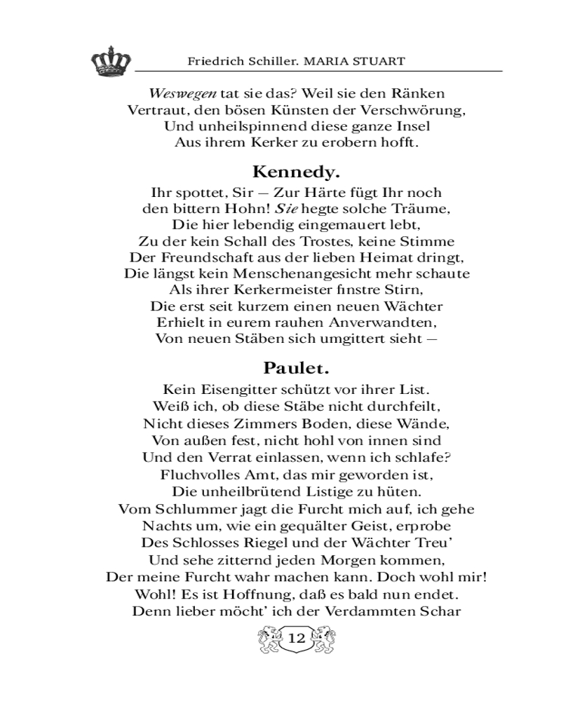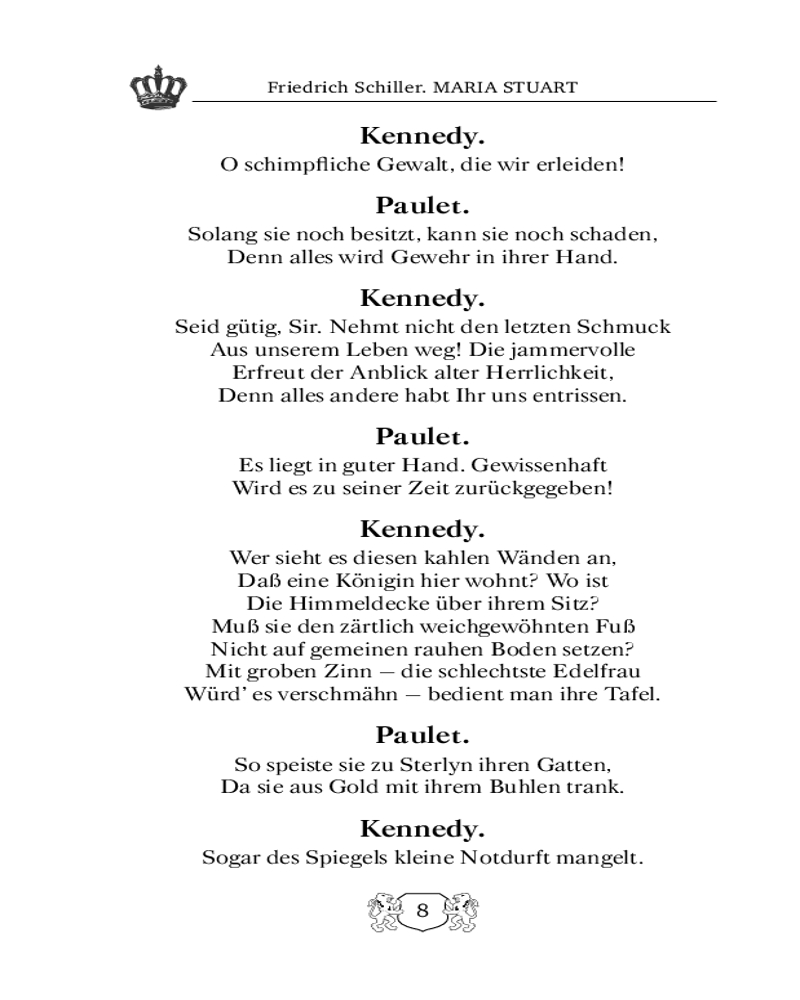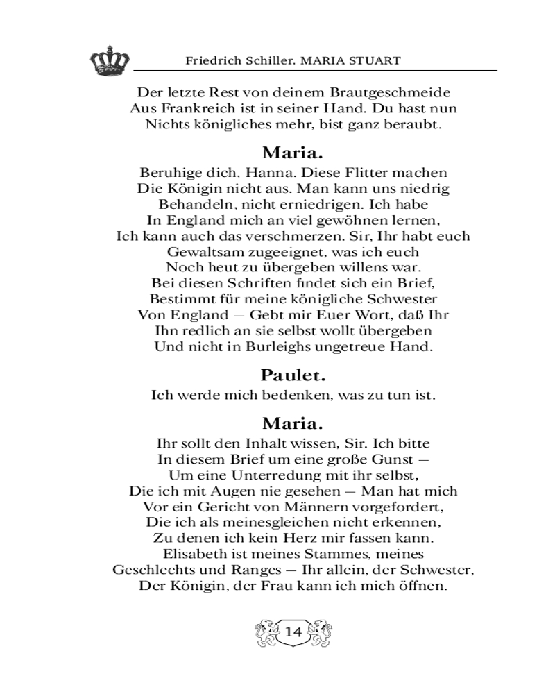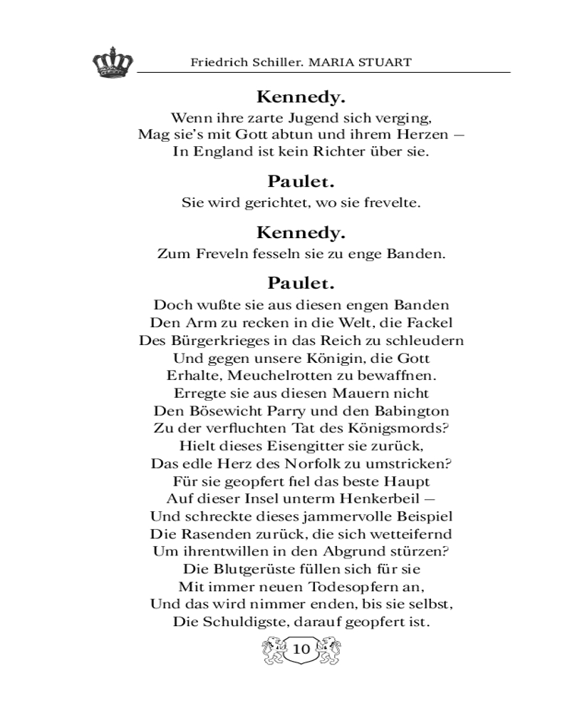 💳 Оплатить за товар можно при получении 🇰🇿 Есть бесплатная доставка по Казахстану от 1 дня 🎁 Копите бонусы с каждой покупки Серия: Goldene Kollektion der Weltliteratur Что важнее — захватить власть или обрести личную свободу? Может ли искренняя любовь выжить в мире, где господствуют общественные предрассудки, жестокость и предательство? Фридрих Шиллер, один из величайших немецких поэтов, ставит своих героев перед мучительным нравственным выбором. В книгу вошли самые знаменитые пьесы Шиллера — «Мария Стюарт» и «Коварство и любовь», — справедливо считающиеся вершиной немецкой драматургии. Противостояние двух королев в трагедии «Мария Стюарт» раскрывается не только как борьба за власть, но и как столкновение честолюбий, ревности и женской гордости. Шотландская королева Мария Стюарт после свержения с престола ищет убежища у своей кузины, английской королевы Елизаветы I. Однако вместо спасения ее ждут ложные обвинения в заговоре против королевы, тюрьма, неправедный суд и казнь. |