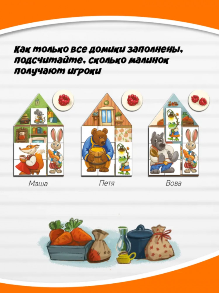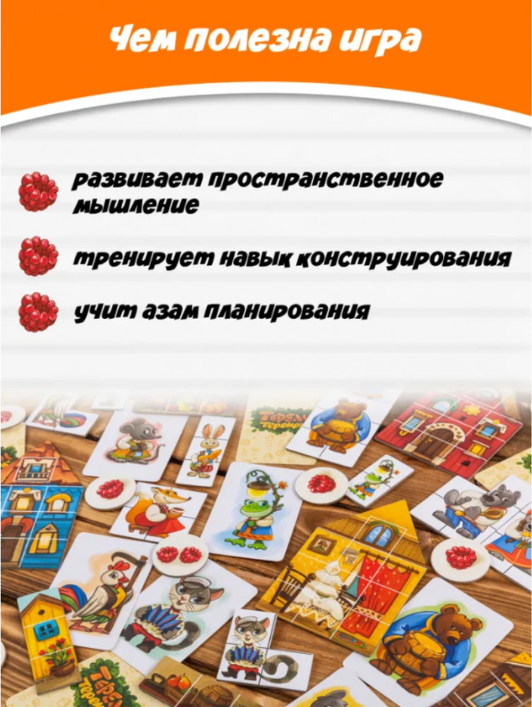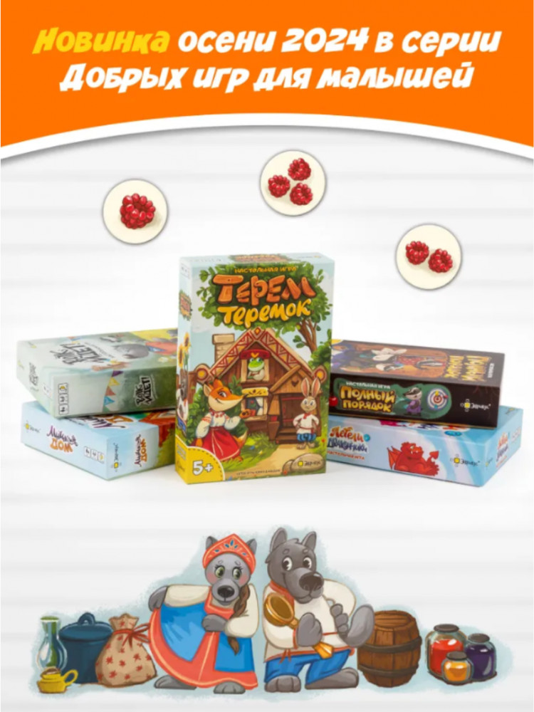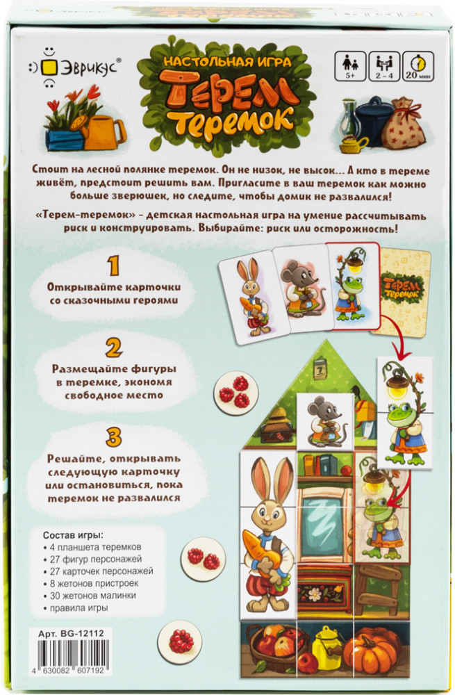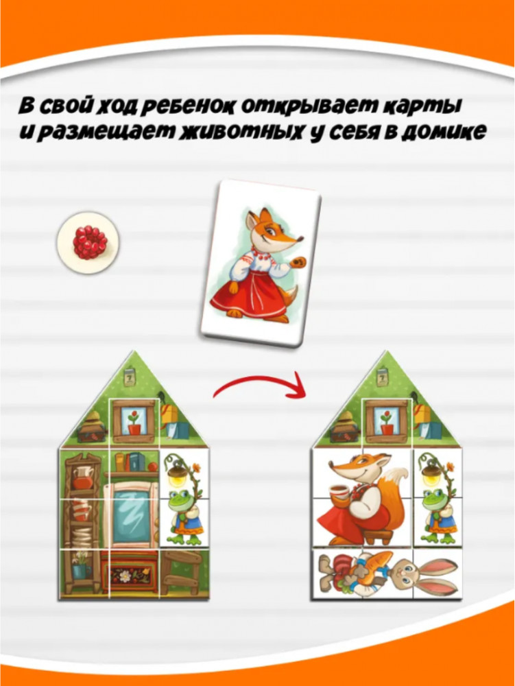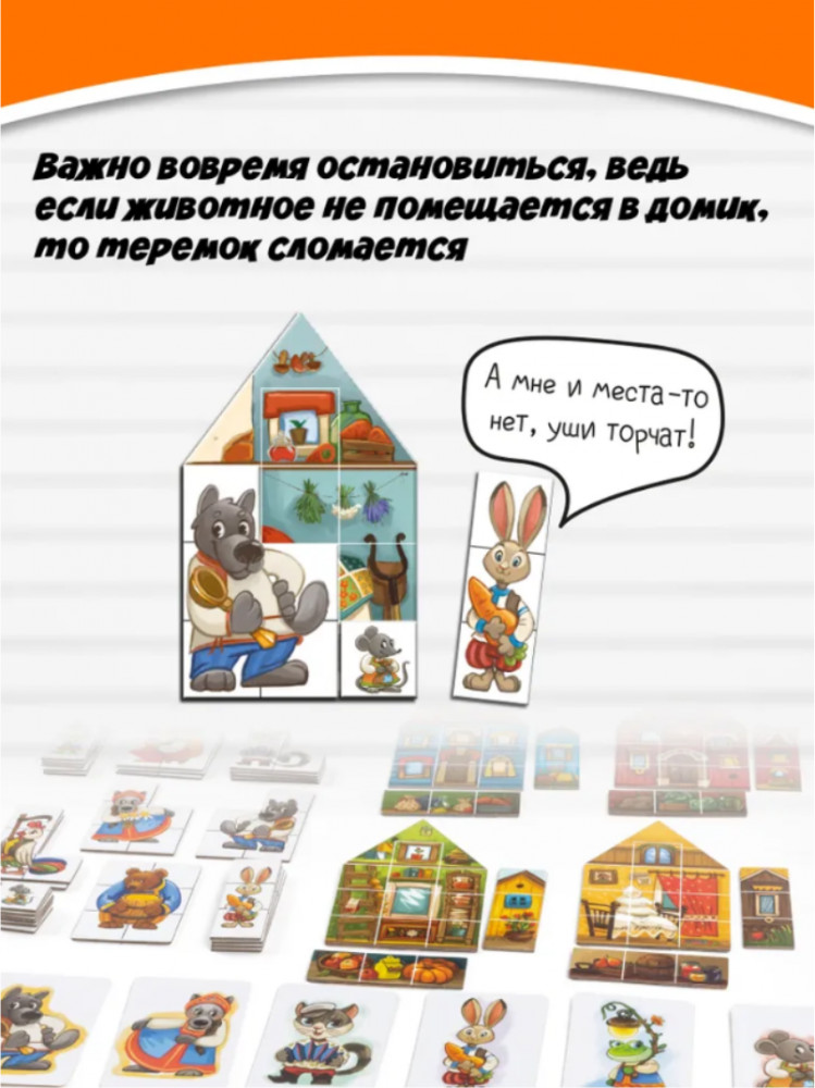 💳 Оплатить за товар можно при получении 🇰🇿 Есть бесплатная доставка по Казахстану от 1 дня 🎁 Копите бонусы с каждой покупки Стоит на лесной опушке теремок. Он не низок, не высок... А кто в тереме живёт, предстоит решить вам. В гости придут известные всем мышка-норушка, лягушка-квакушка, зайчик-побегайчик, лисичка-сестричка, волчок-серый бочок, да не один, а с милой волчицей, мишка косолапый, а ещё котик-тёплый животик и петушок-золотой гребешок. Пригласите в ваш теремок как можно больше персонажей, но следите, чтобы всем хватило места — иначе теремок развалится! |