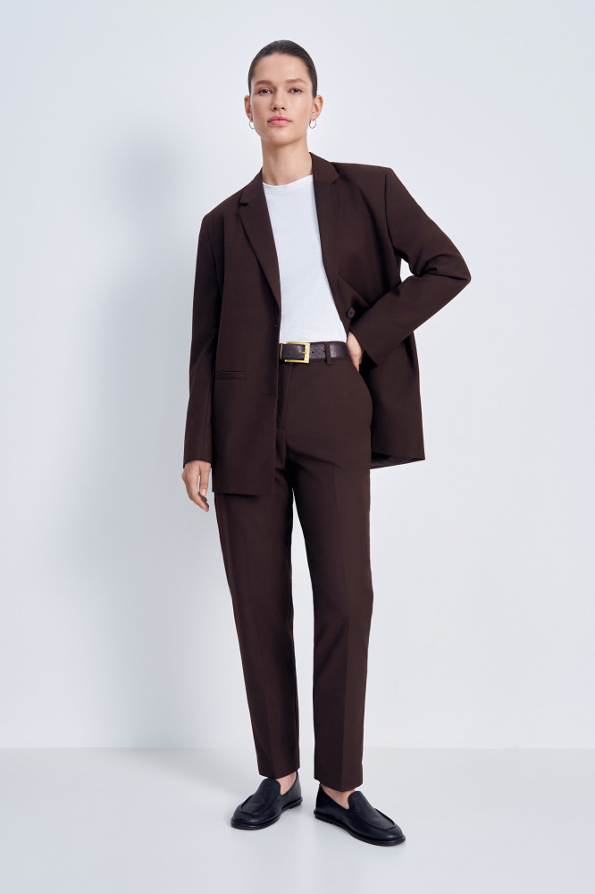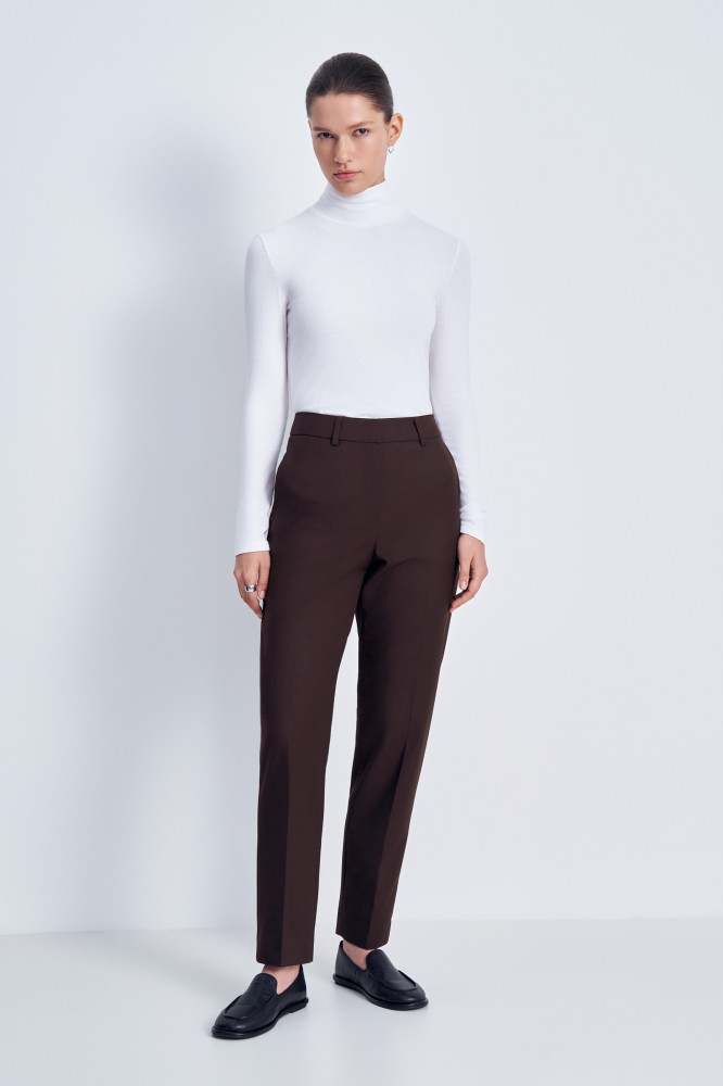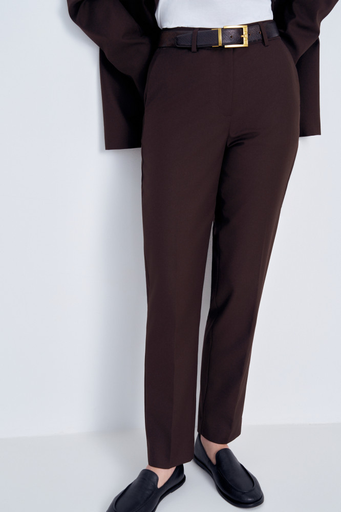Брюки со стрелками из струящейся ткани. Посадка carrot fit сужается к низу, создавая стильный полуприлегающий силуэт. Длина брючин 7/8. Мягкая ткань приятна к телу и отливает мягким блеском на свету. Хорошо подойдут для образов в стиле casual.