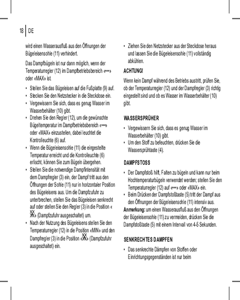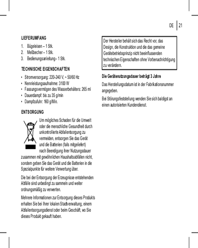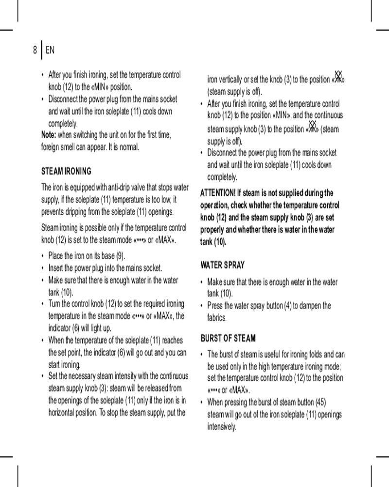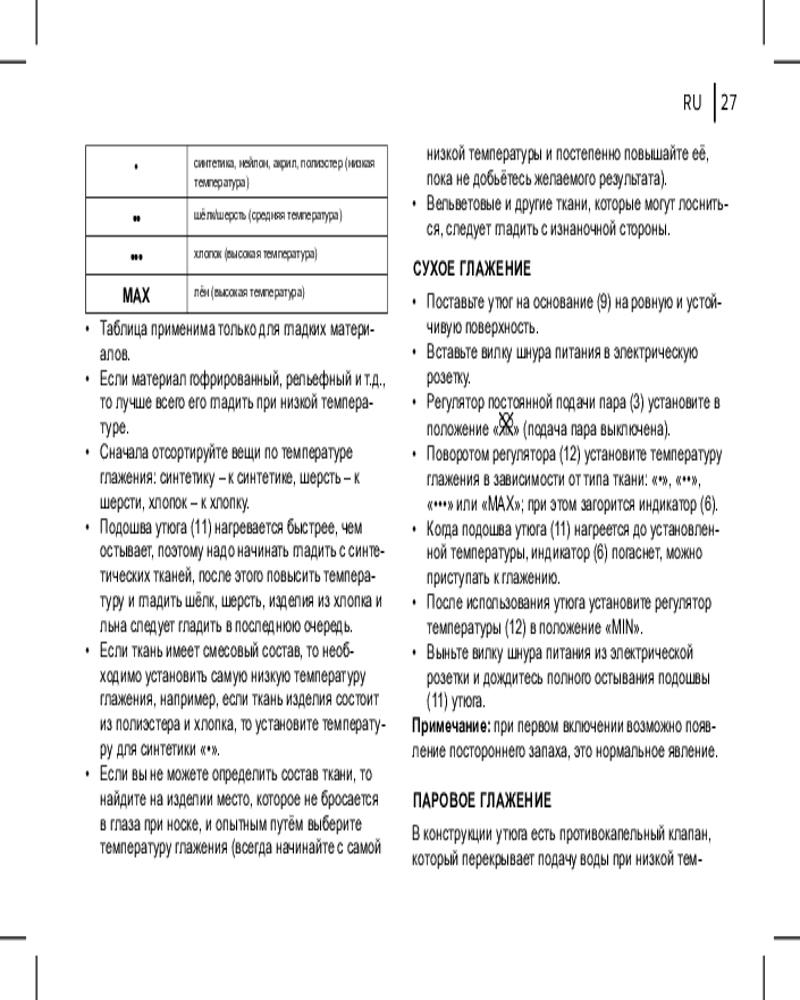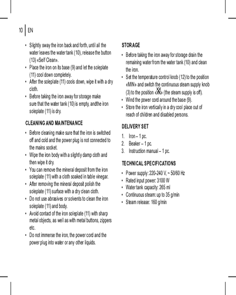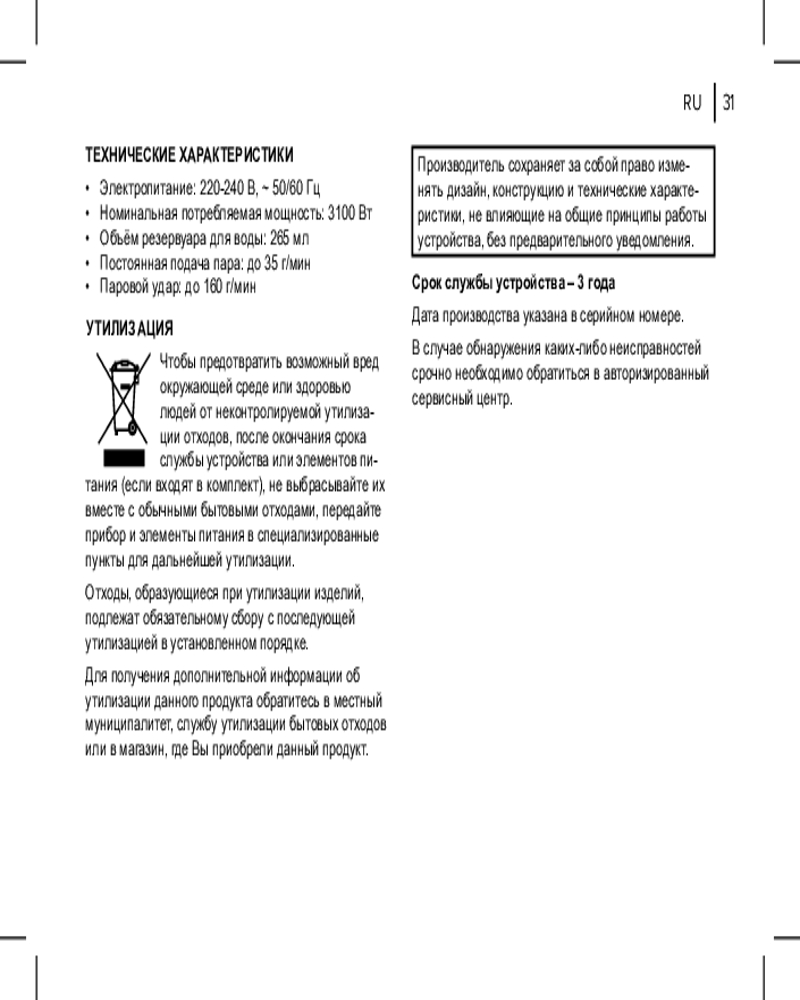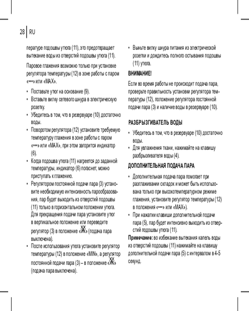 Brayer Утюг с отпаривателем BR4012В данный момент этот товар отсутствует в продаже. Возможно, у нас найдется аналогичный или похожий товар здесь. Надежный и мощный утюг — мощность утюга составляет 3100 Вт. Максимальный паровой удар 160 г/мин. Постоянная подача пара 35 г/мин. Подошва из керамики обеспечивает бережное глажение и избавляет вещи от складок. Объем резервуара для воды составляет 265 мл. Функция самоочистки позволяет прибору автоматически избавляться от загрязнений и накипи, что продлит срок службы утюга. |