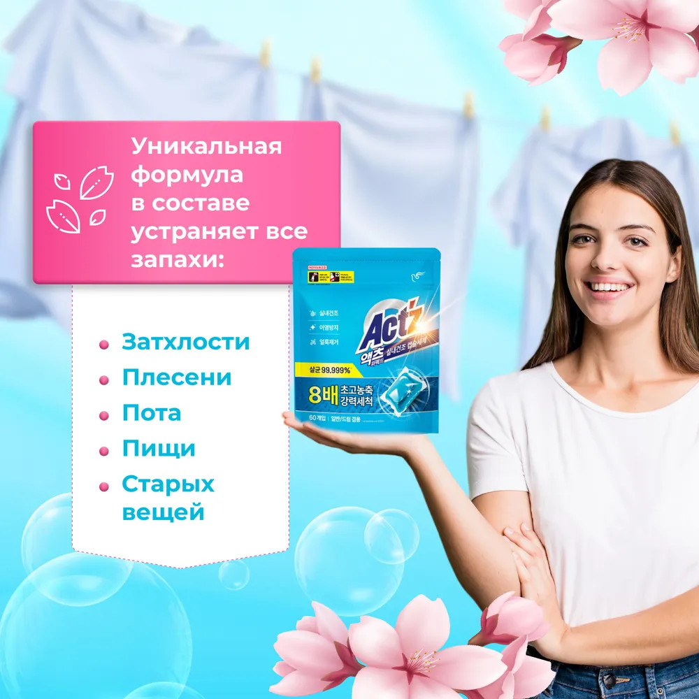 • сушка в помещении — уникальная технология и ферменты обеспечивают устранение посторонних запахов (затхлости, плесени, пота, пищи, старых вещей);