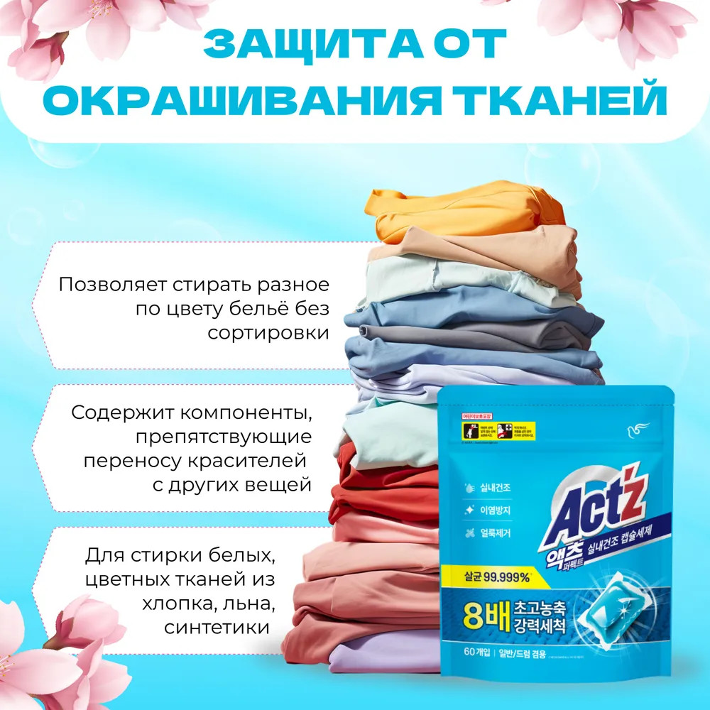 • защита от окрашивания тканей — позволяет стирать разное по цвету бельё без сортировки, содержит компоненты, препятствующие переносу красителей с других вещей. Подходит для стирки белых и цветных тканей из хлопка, льна, синтетических волокон;