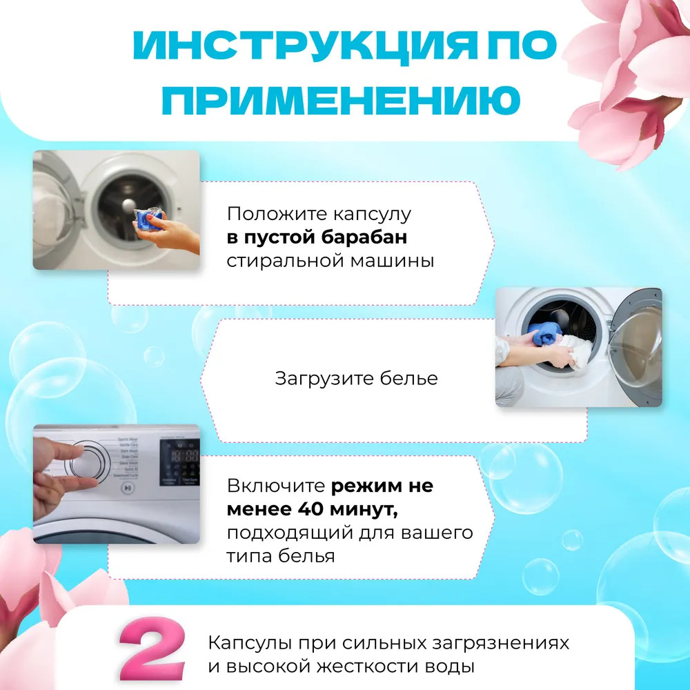 Способ применения: положите одну капсулу в пустой барабан стиральной машины, после чего загрузите белье, выберите нужную программу и запустите стирку. Менее 5 кг белья достаточно одной капсулы. Используйте 2 капсулы при стирке белья более 5 кг, сильного загрязнения белья или жесткой воды.