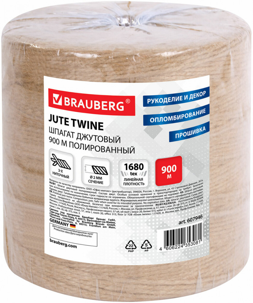 Джутовый полированный шпагат Brauberg отлично подходит для рукоделия и декора, упаковки товаров, опломбирования и прошивки документов. Изготовлен из натурального сырья растительного происхождения. Длина шпагата — 900 м, диаметр нити — 2 мм, линейная плотность 1680 текс. Каждая бобина упакована в термоусадочную пленку.