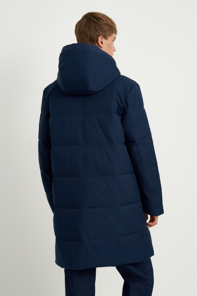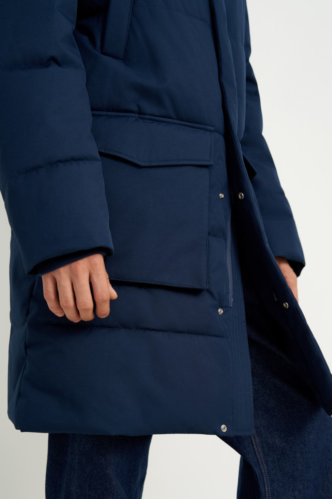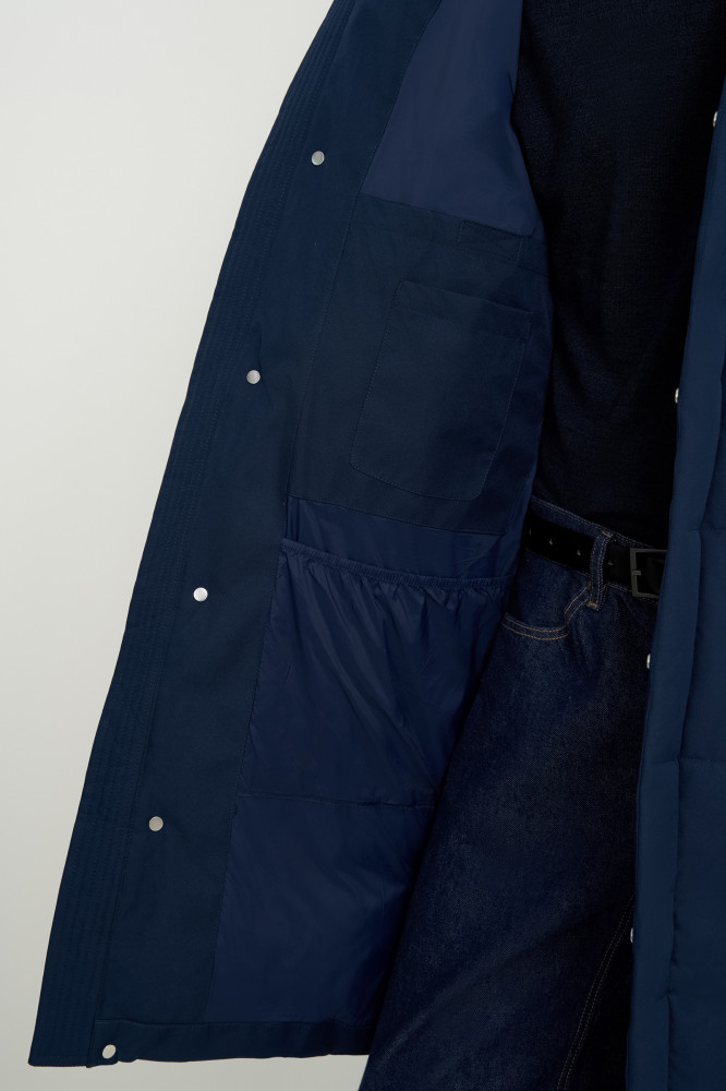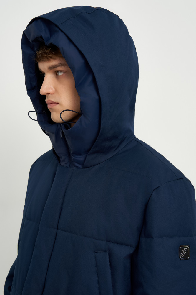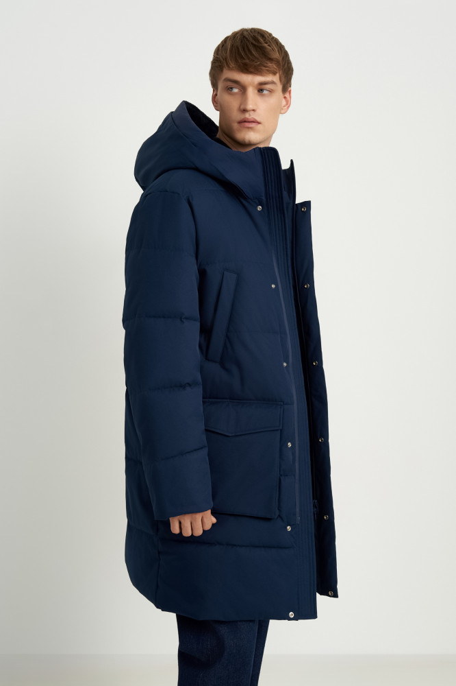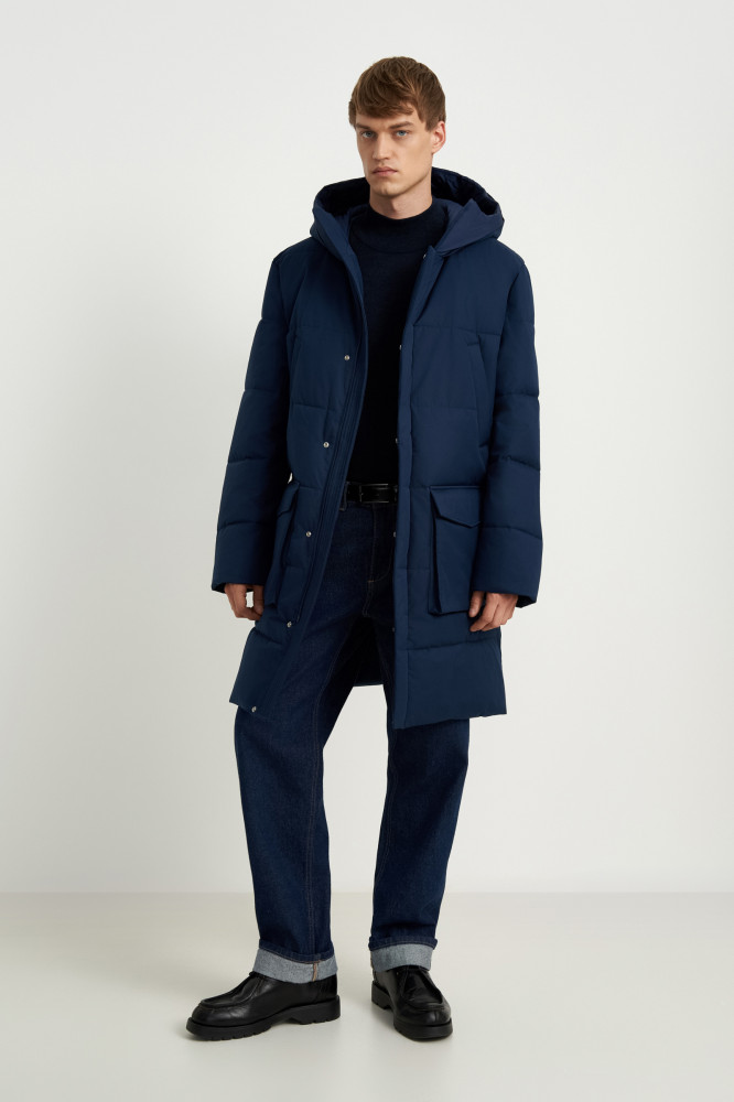 Базовая стеганая куртка прямого кроя длиной до середины бедра. Основной материал куртки — плотная плащевая ткань с водоотталкивающими свойствами. В качестве утеплителя — Downfill. Он легкий, объемный, отлично сохраняет тепло и форму. На капюшоне используются скрытые стоперы для фиксаторов. Особенность стопперов состоит в том , что они не видимы с лицевой части, но при этом выполняют функцию регулировки высоты капюшона. Внутри рукавов мягкие вязаные манжеты.