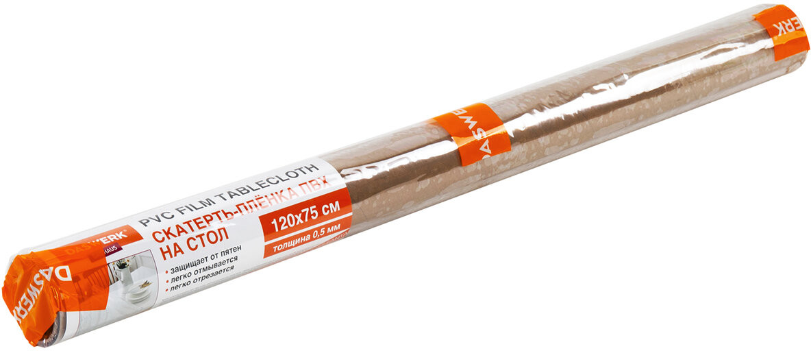 Скатерть прямоугольная размером 120 × 70 см расстилается на любую поверхность подходящего размера: в первую очередь, это клеенка на стол на кухню, но также прозрачная пленка подойдет на письменный стол или на детский столик. При необходимости пленка на стол легко нарезается ножницами под нужный размер и форму и подойдёт для подоконника или полки. Также за несколько минут из скатерти клеёнки можно вырезать дорожку на стол или плейсмат меньшего размера. Прозрачная скатерть для стола сохраняет и подчёркивает естественную текстуру камня, дерева, стекла или пластика и впишется в любой интерьер. Свернутая в рулон на картонной втулке скатерть гибкое стекло доставляется в прочной термоусадочной пленке, защищающей от повреждений при транспортировке. Скатерть на кухонный стол Daswerk — это практичное решение для повседневного использования.