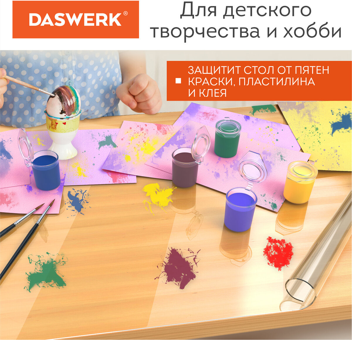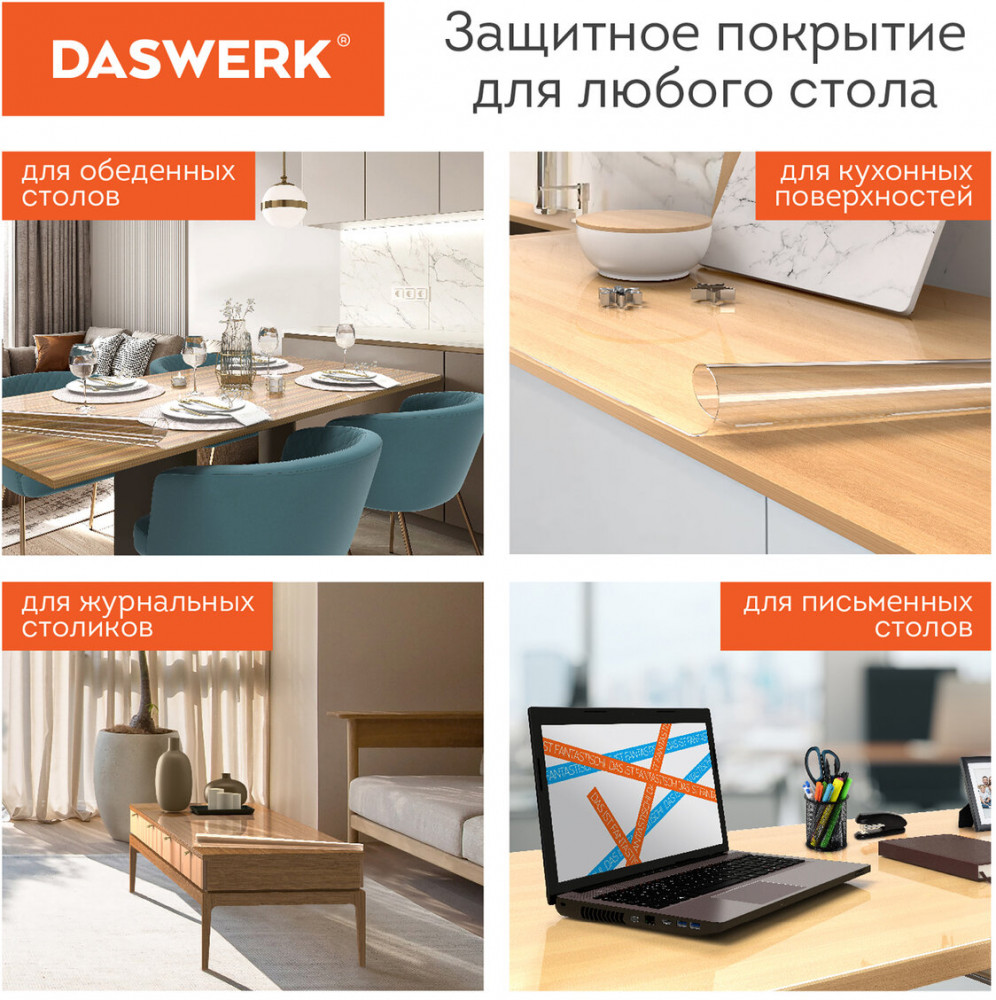Скатерть-клеенка на стол Daswerk удобна и практична для многоразового использования. Скатерть на стол (пленка на стол прозрачная) незаменима дома, в офисе, в местах общественного питания, а также для мероприятий на открытом воздухе. Силиконовая скатерть на стол, также известная как жидкое стекло или гибкое стекло, предназначена для защиты горизонтальных поверхностей от загрязнений и механических повреждений. Благодаря своей толщине 0.5 мм гибкое стекло на стол защищает от царапин, сколов и вмятин. Также скатерть силиконовая не боится пищевых масел и красителей и очень неприхотлива в уходе — жидкое стекло на стол достаточно протереть влажной салфеткой.