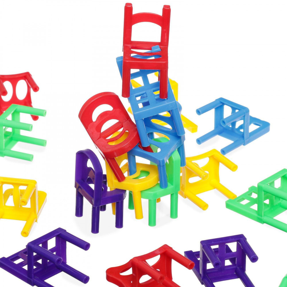 Если картинка на карте расположена горизонтально, расставляйте стулья в один ряд друг за другом, располагая цвета слева направо — так, как указано на картинке! Если картинка на карте расположена вертикально — ставьте стулья друг на друга. Первым нужно поставить стул, цвет которого находится в самом низу картинки, а далее действовать так, как указано на карточке. Обратите внимание: в колоде есть особые карточки. Объекты на них расположены горизонтально, но два из них нарисованы друг над другом. Вам необходимо поставить стулья того же цвета один на другой, а остальные расположить в ряд возле них. Как только вы расставите стулья, скорее ударяйте по звонку! Сделали это быстрее всех участников и расставили стулья правильно — забирайте карточку себе. Если вы не успели ударить по звонку, но видите, что игрок, который это сделал, расставил стулья неправильно, у вас есть шанс забрать карточку. Скорее ударяйте по звонку, пока никто вас не опередил. Как только карточки в колоде закончатся, пришло время подводить итоги. Победителем становится тот, кто набрал наибольшее количество карт. В правилах вы также найдёте ещё два варианта игры. Выбирайте, какой из них понравится вам больше всего, и веселитесь!