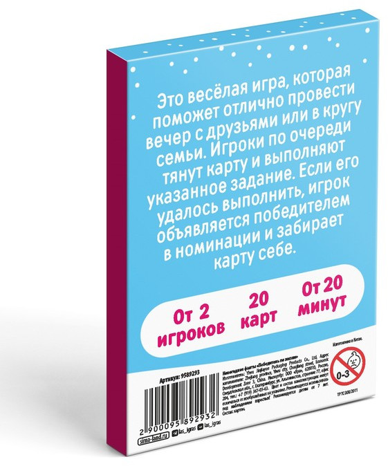 Это весёлая игра, которая поможет отлично провести вечер с друзьями или в кругу семьи. Игроки по очереди тянут карту и выполняют указанное задание. Если его удалось выполнить, игрок объявляется победителем в номинации и забирает карту себе.