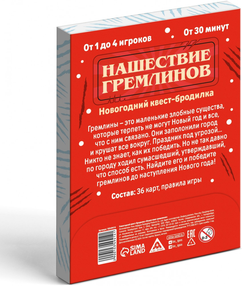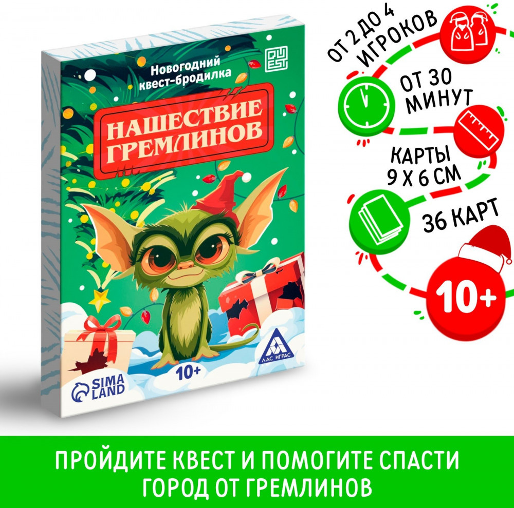 💳 Оплатить за товар можно при получении 🇰🇿 Есть бесплатная доставка по Казахстану от 1 дня 🎁 Копите бонусы с каждой покупки Серия: Квест Новогодний квест-бродилка. Гремлины-это маленькие злобные существа, которые терпеть не могут Новый годи все, что с ним связано. Они заполонили город и крушат все вокруг. |