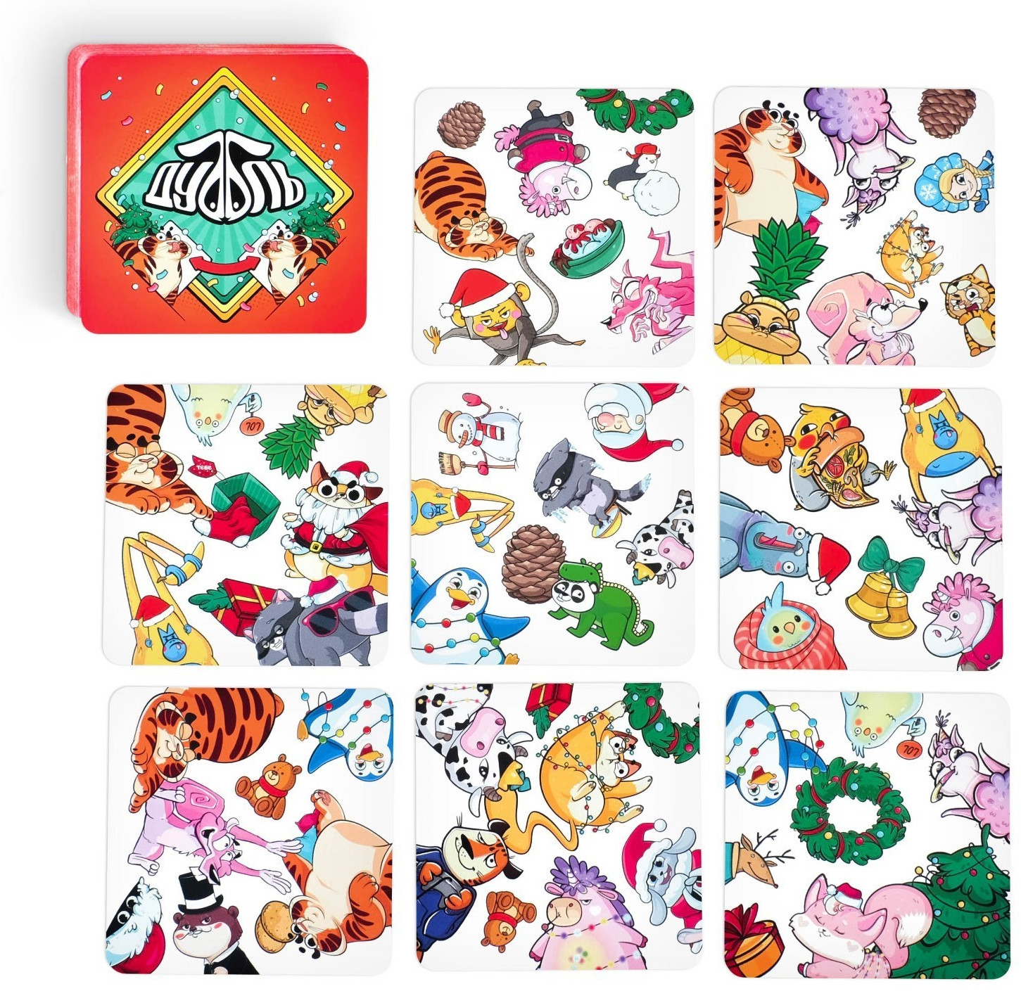 Первый, кто отыщет такую картинку, кричит её название, забирает верхнюю карту из колоды и кладет её сверху на свою карту. Тем самым он открывает следующую карточку из основной колоды. Теперь совпадения нужно искать уже с другими картинками. А как только все карты в колоде закончатся, переходите к подведению итогов. Игрок, который набрал больше всех карт, объявляется победителем!