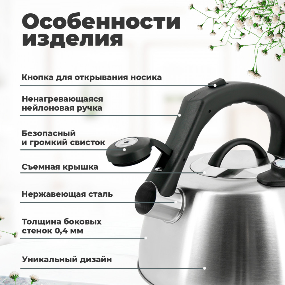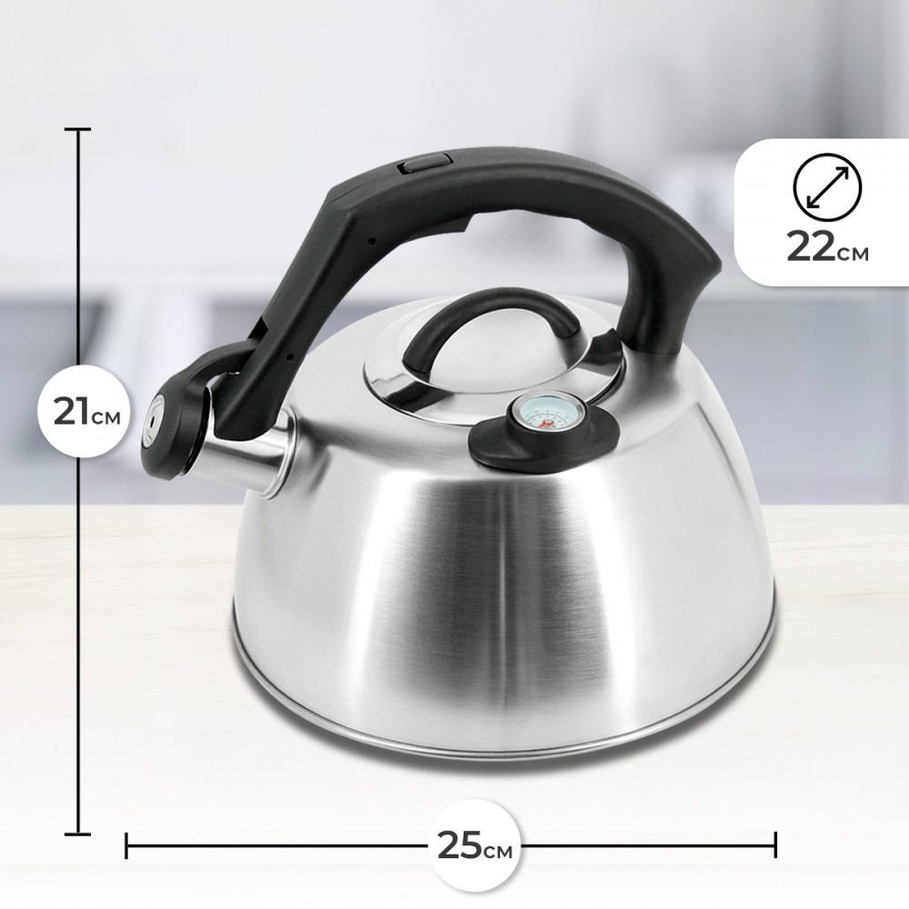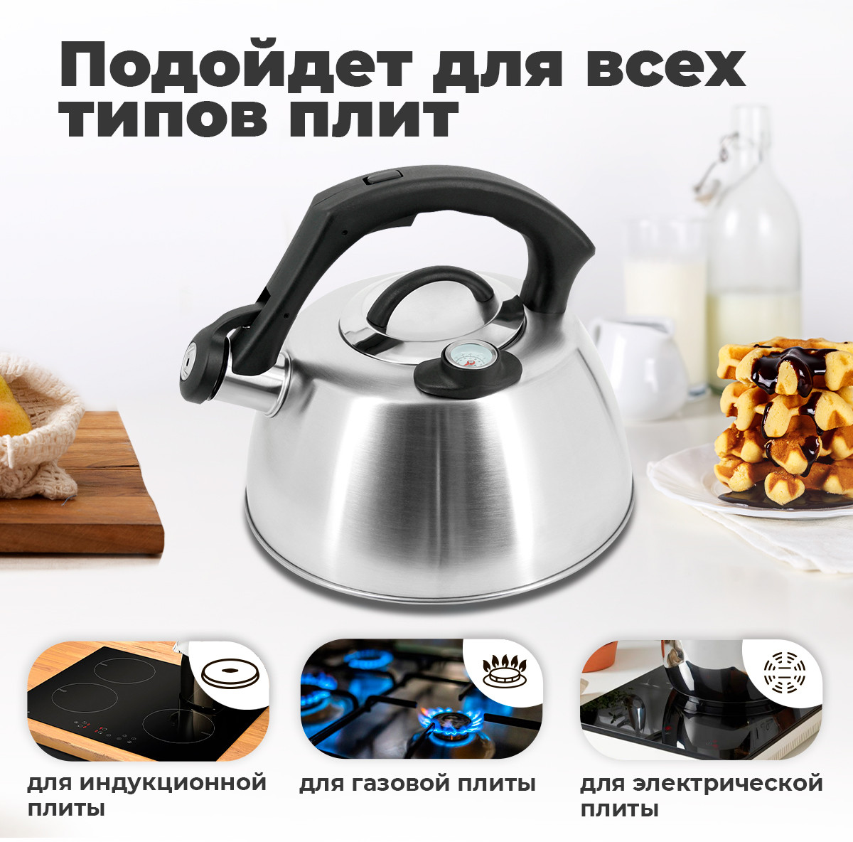 Чайник с объёмом 2,5 как раз такой искала. Всё соответствует описанию: быстро закипает, так как стенки тонкие, удобные ручка и свисток. Сделан на самом деле из нержавейки, прошёл испытание магнитом))))